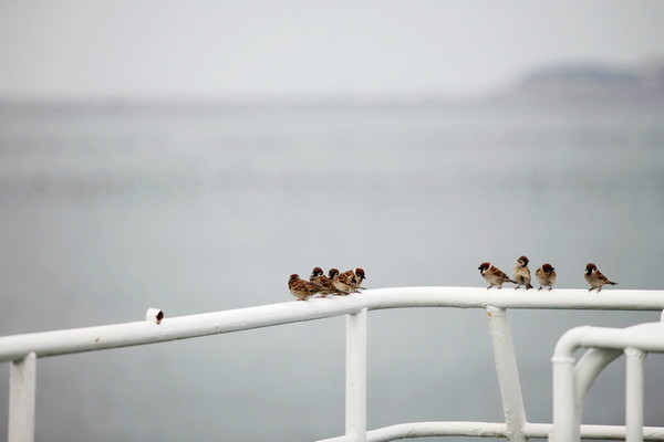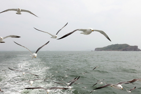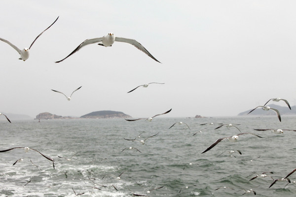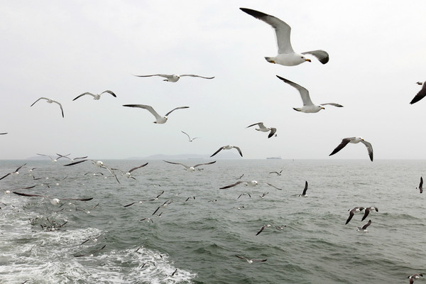 大家都拿出方便面、餅干等開始喂海鷗了。 食物一把把的扔出去,海鷗們愉悅的叫著的越聚越多啦!這時就體現(xiàn)出我們花錢上平臺的正確性了,上邊視野非常好,海鷗會在離你很近的地方隨行,甚至觸手可及了。還有個關(guān)鍵的好處是,船上風(fēng)很大,大家都在專心喂食,撒出去的方便面渣子很多都被吹了回來,結(jié)果是樓下一層的同志們都頂著一腦袋的方便面渣子。當(dāng)同行的人發(fā)現(xiàn)后就跟大猩猩摘虱子似得扒拉著同伴的頭發(fā)。。。