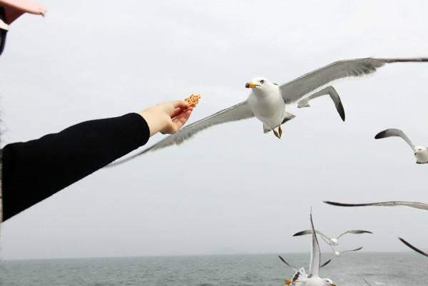 正玩兒的起勁兒,剛才收費的工作人員過來告訴我們:別光扔吃的,整個大塊的拿手里等海鷗來叼走!老婆掰了一大塊方便面舉起來,沒一會兒就被盤旋的海鷗俯沖下來叼走了。太好玩兒了,我也學(xué)著跟老婆要了一 小 塊方便面舉著,看清楚了沒寫錯,是一 小 塊面啊??!結(jié)果面也被叼走了,還被海鷗同學(xué)順勢叼了一下手指頭,還好叼在了兩個指甲蓋上,只是疼了下,沒有受傷