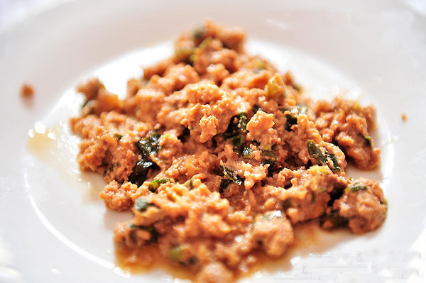 當(dāng)天的海膽雖然新鮮,但是并不太肥,于是老板娘細(xì)心地加入雞蛋和蔥末,與絞碎的海膽肉同蒸,海膽的鮮咸中夾雜著雞蛋的甜香和蔥的清香,融合得恰到好處。吃到嘴里,不但味道更充實(shí)豐富,口感也更柔軟綿糯。老板娘還給這道菜起了一個(gè)好聽(tīng)的名字——芙蓉海膽。