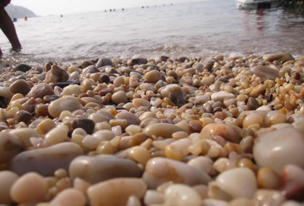 翌日天微明,夜里睡不好,習慣賴床的我早早就起來,徑直朝海灘奔。這下看真切了,夜露的浸潤,使灘上的石頭猶如色染,花顏麗貎。但可能是附近有數家賓館,平日游客多,揀石又來得方便的緣故,灘表面的好球石不多見了,更多的是正在向扁圓體演變的半成品。我扒開石堆,揀了三四枚滿意的,蹲下身,讓海水沖刷上面的黏泥。浪花撲上來又退下去,退下去又撲上來,那我用手怎么抹也抹不掉的黏泥,它只兩下就蕩滌得一干二凈,剛剛還污頭垢面的石頭轉眼晶瑩剔透,光彩煥發(fā)。海浪的力量何其大!而它每天都這樣無休止地運動,這樣不停歇地打磨著灘上的石頭,它有的是耐心,有的是工夫,慢慢地,柔軟的海水就把堅硬無比的石頭淘瀝得玲瓏可人(只是淘瀝再好的美石不會屬于我了,我是個可憐的匆匆過客)。在開了又謝、謝了又開的海浪前久久佇立,似可見一斑地看到了美石“進化”的過程,看到這個過程對我宇宙、人生的啟迪,也許比揀到多少美石還要有意義。這是一個意想不到的收獲。不知不覺間太陽冒出海面,倏忽又鉆進厚厚薄薄的魚鱗云。那抹云霞是那么絢爛,頗像我腳下的這彎彩石灘。但我說不清是彩石灘復制于天邊的云霞,還是天邊的云霞其實就是這彎彩石灘被哪位神仙掛在了那里?