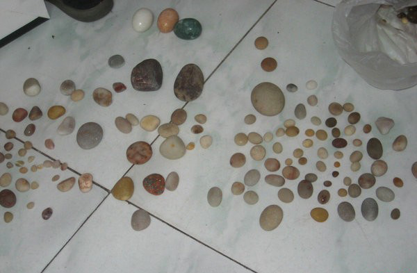 我們撿的,花色好的就是不圓也沒(méi)放過(guò),上邊形似雞蛋的是買的,據(jù)說(shuō)深海里打撈天然的球石呢。