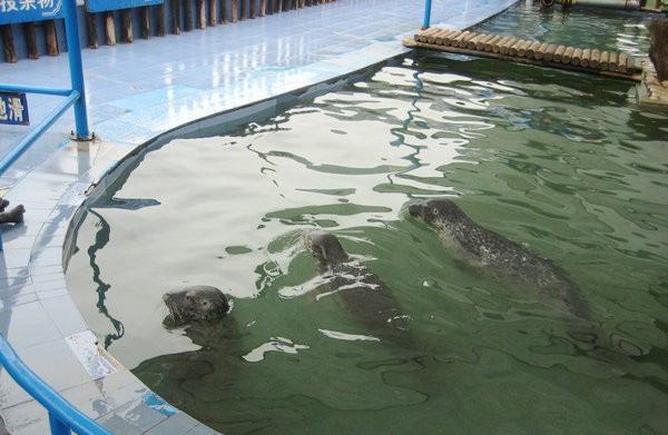 在月牙灣,正好能喂食小海豹,小魚10元一份,6、7條的樣子,可以近距離的接觸它們,當(dāng)我們拿著小魚靠近池子,聰明的它們立刻爬上來(lái),伸頭到你手中覓食,,有一個(gè)最大的海豹老奸巨猾,它不好意思跟小海豹爭(zhēng)食,又生怕你手中的小魚被吃光,竟然在旁邊用鰭拍打著自己的肚皮,嘴里發(fā)出“呃呃 呃呃 ”的撒嬌聲乞食,簡(jiǎn)直把人萌翻了。