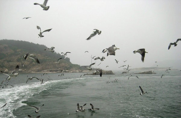 還不是旅游旺季,據(jù)說(shuō)到了7、8月份游人爆滿,吃住不預(yù)定都不行,所以我們選擇這個(gè)時(shí)間進(jìn)島還不錯(cuò)。乘坐的郵輪大約航行40分鐘,海面風(fēng)平浪靜,成群的海鷗跟在船后,發(fā)出叫聲,那場(chǎng)面蔚為壯觀,原來(lái)它們是為了吃浪花翻飛出的小魚兒,大家把餅子、面包、方便面掰成小塊,拋上天空,海鷗們盤旋著,一個(gè)俯沖接到口中。