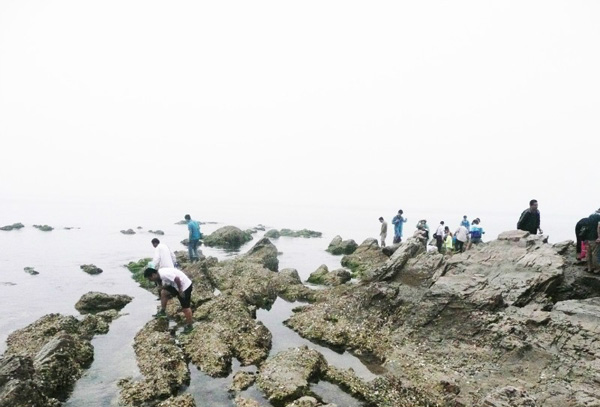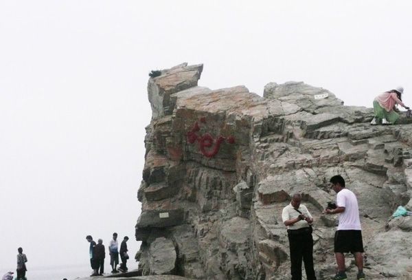 進(jìn)入景點(diǎn),看到一塊巨石豎立,巨石的基座上有“長(zhǎng)山列島國(guó)家地質(zhì)公園”等字。旁邊一塊石頭上刻有“福海三島”四個(gè)蒼勁有力的大字。從石頭的左邊往下走百余米,就到了礁石裸露的海灘。礁石上長(zhǎng)有綠色的海藻。許多游客正在彎腰揀拾好看的卵石。南側(cè)有一巨石名“龍?zhí)ь^”,從高處看時(shí)有點(diǎn)像,從下邊看卻不像了。沒有風(fēng),水波撫摸著沙灘,發(fā)出輕微的聲響。由于剛下過雨,不遠(yuǎn)處便霧茫茫的一片,水天一色,分不清哪是海水哪是天空了。山上林木茂密,山下巨石裸露,其顏色由紅色漸變?yōu)榛疑Q麦w呈現(xiàn)斑駁皺裂、縱橫崢嶸的面貌,這就是所謂的“地質(zhì)公園”吧。導(dǎo)游規(guī)定的游玩時(shí)間很短,只有一個(gè)小時(shí),便匆匆拍了一些圖片后離去。