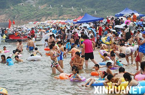 8月5日,游客在山東省長(zhǎng)島縣半月灣戲水。
