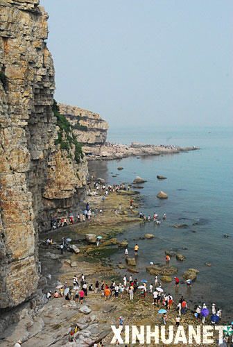 8月5日,游客在山東長(zhǎng)島縣九丈崖景點(diǎn)游玩。