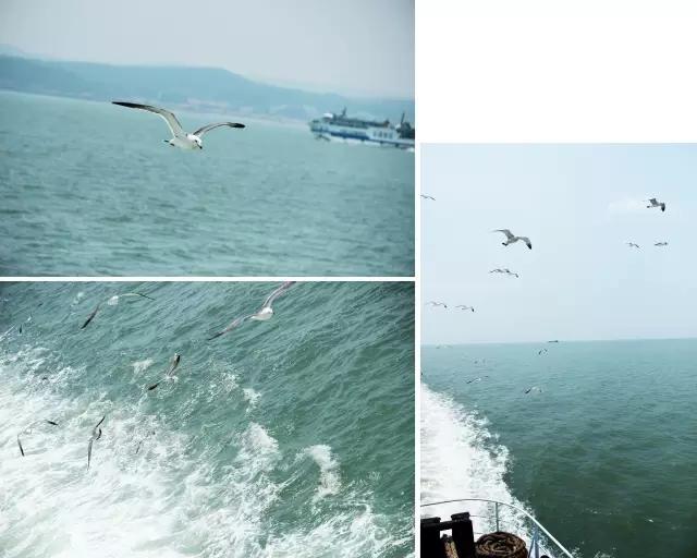 過海時(shí)我乘坐的是一艘大船,能開車上去的那種?!皢鑶鑶琛?,拋錨,船開,駛?cè)?,四面入眼的全是茫茫大海,感覺自己就要前往那海的盡頭。隨著輪船的駛動(dòng),輪船員工的哨聲響起,一只只海鷗漸漸向船只靠攏。一只、兩只、直至一群,那是我第一次在船上看這樣壯觀的海鷗群景象,著實(shí)震撼了一下。它們或組群,或單飛;或沉海,或破風(fēng),它們絲毫不怕生,有的竟還調(diào)皮地飛過游客的肩膀,或饞嘴地啄起游客手中的面包屑,惹得各種手機(jī)相機(jī)咔咔閃不停。