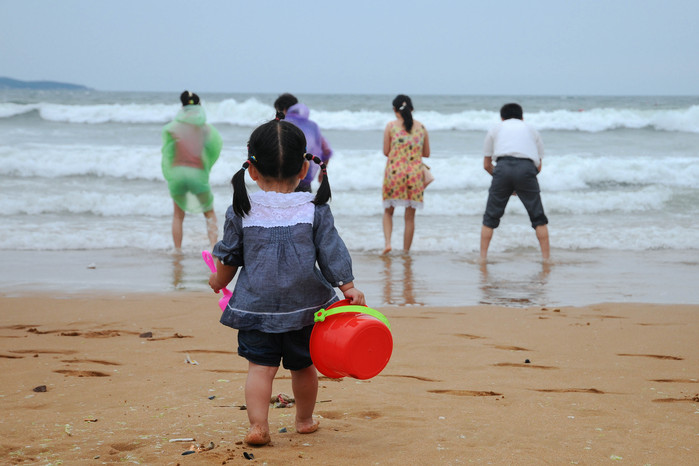 早晨,懶覺起來,小雨,我們依舊俺計劃出發(fā)金沙灘,平時積善行德做好人好事,老天給了面子,到了沙灘居然天空逐漸放晴,走在軟軟的海灘上,感受著海浪(一米浪,已經(jīng)不讓下海游泳)濕身的感覺真好。娃子第一次見大海,高興的嗷嗷直叫,怎么都拉不住,這是天性??
