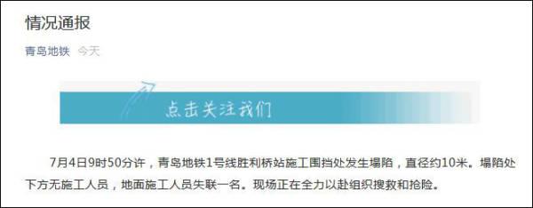 據(jù)微信公眾號(hào)“青島地鐵”7月4日消息,7月4日9時(shí)50分許,青島地鐵1號(hào)線勝利橋站施工圍擋處發(fā)生塌陷,直徑約10米。塌陷處下方無(wú)施工人員,地面施工人員失聯(lián)一名?,F(xiàn)場(chǎng)正在全力以赴組織搜救和搶險(xiǎn)。