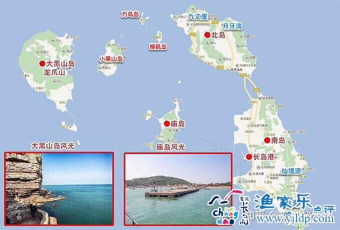 長(zhǎng)島, 又稱“廟島群島”, 地處膠東、遼東半島之間,在黃渤海交匯處,與煙臺(tái)下屬市蓬萊市隔海相望。長(zhǎng)島共由32個(gè)大小不同的島嶼組成,如下圖,一般說(shuō)“長(zhǎng)島”即指 "南北長(zhǎng)山島",從蓬萊過去先登陸在這里,主要景點(diǎn)吃住都在這里,后面可以再乘船去其他小島。