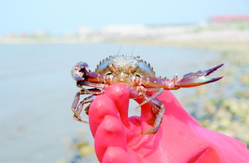 在南莊趕海園,一位游客趕海抓到了一只赤甲紅?!?
