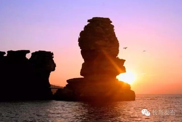 暮色中的大小黑山島、廟島、仙鶴島錯(cuò)落有致,宛如美人一般,散發(fā)出迷人的光彩;寶塔礁則像一個(gè)調(diào)皮的孩子,一下子將紅彤彤的夕陽(yáng)吞入口中,形成寶塔含珠的奇特景象。