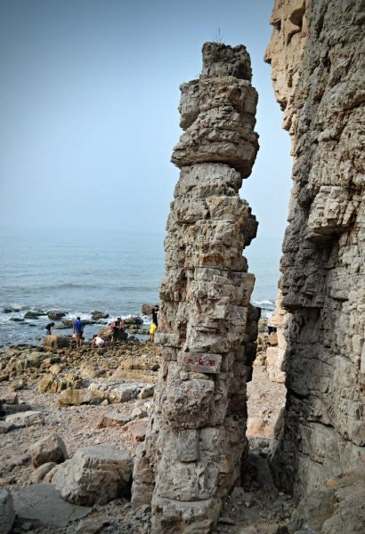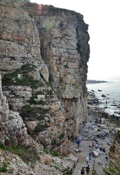 由于千萬(wàn)年來(lái)狂風(fēng)海浪的淘滌,那本來(lái)垂直的石壁底凹上凸,出現(xiàn)了大于90度的傾斜,即使是烈日當(dāng)空,崖下卻總是能保留著一片陰涼,使崖上崖下形成兩個(gè)天地,大有“陰陽(yáng)割昏曉”的意境。