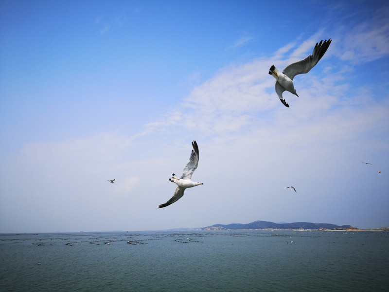 玩得太嗨,不知不覺(jué)已過(guò)了飯點(diǎn),在歐樂(lè)堡簡(jiǎn)單吃了點(diǎn)東西,我們便回酒店取行李,去趕當(dāng)天的最后一班船,準(zhǔn)備啟程前往下一個(gè)目的地——長(zhǎng)島。登船漫游在蔚藍(lán)色的大海上,一路海鷗相伴,海風(fēng)陣陣,甚至還可以看到黃海和渤海的分界線(xiàn),兩種顏色,互不相融,堪稱(chēng)奇絕。