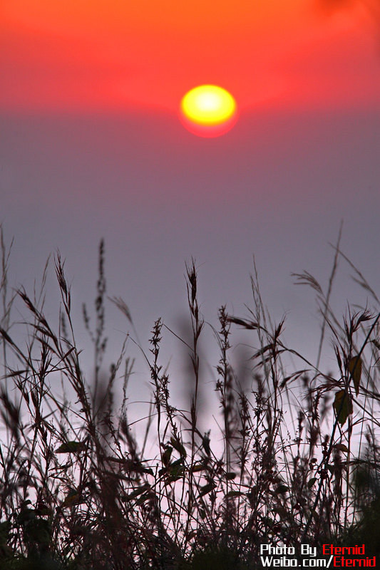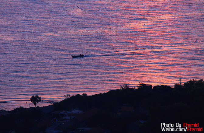 第二日日落,在山頂觀鳥完畢,拍到了鴨蛋黃一樣的日落和日落后海面泛著的紫色光暈。