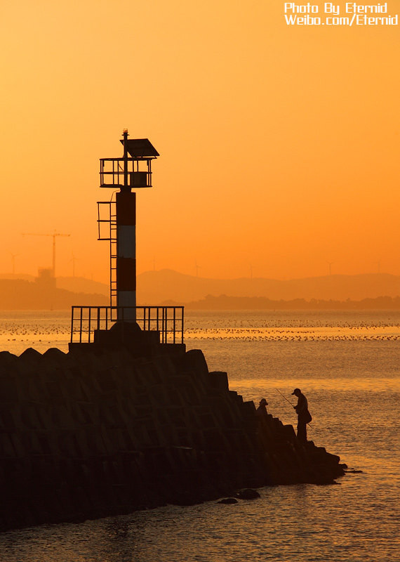 在海濱碼頭發(fā)現(xiàn)一些垂釣者,各自都在忙碌垂釣著,當(dāng)時正趕上日落逆光,直接用剪影去表現(xiàn)他們的外形和生活狀態(tài),畫面極好。