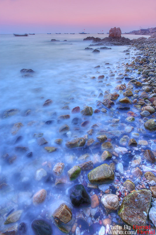 大黑山島海濱日落,礁石和余輝相互映襯,我不想說它有多美多美的贊美之詞,大家自己看圖就好。這里并沒有細(xì)致入微的金色沙灘,只有礁石嶙峋的卵石海岸,另一番別致景象。