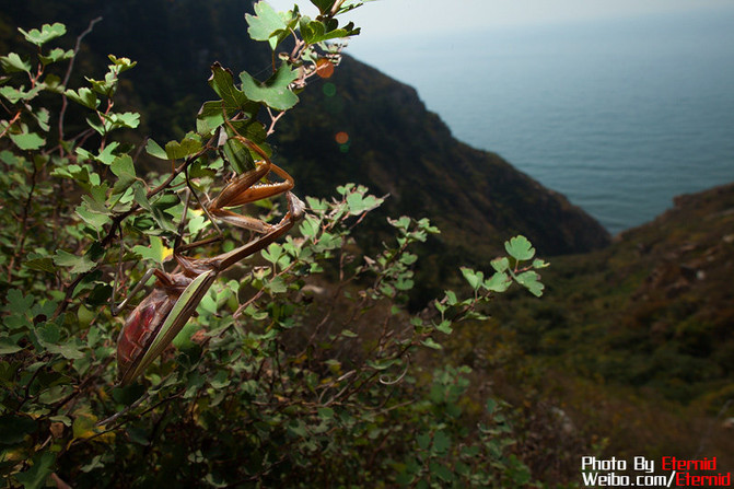 此時,大黑山島的昆蟲也所剩無幾,孤零零看到幾只“黃蜻”在飛舞,太過普通,沒有興趣拍攝,剩下就是數(shù)量極大的“中華大刀螳”,“中華大刀螳”在這個季節(jié)都處于產(chǎn)卵器,而且雌性極多(占90%),雄性由于完成了交配任務(wù),基本都已被雌性吃掉或者壽終正寢,唯獨雌性“中華大刀螳”獨占著島上的各種環(huán)境。想了許久,決定拍一張海岸版的大刀螳生境靚照,于是在山坡上攀爬、尋覓,終于得償所愿,就是拍攝環(huán)境實在坑爹的不得了。