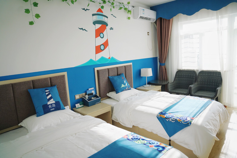 住在島上的漁號(hào)客棧,房間面積不大,勝在生動(dòng)活潑,充滿海洋氣息。房間主色調(diào)為藍(lán)白亮色,燈塔、長(zhǎng)島文字、海鷗等長(zhǎng)島元素滲入到每個(gè)細(xì)節(jié)之中。