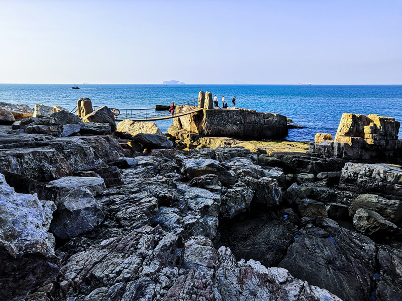 仙人橋,探入海中的一塊巨石,通過一個(gè)小索橋和岸邊的礁石相連。▼