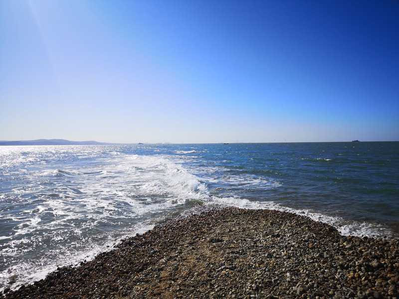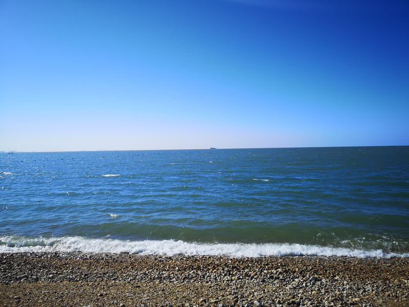 10:00 黃渤海分界線(xiàn)??赐耆粘龊蠡氐骄频?,吃完早餐,然后在房間的窗前享受了一把臨海讀書(shū)的愜意。我再出發(fā)前往黃渤海分界線(xiàn)。這里的海灘石頭較月牙灣的大,路不太好走,建議穿運(yùn)動(dòng)鞋,注意路面不要崴腳。