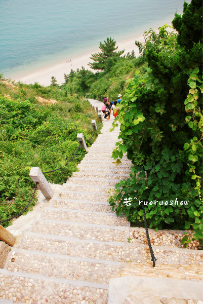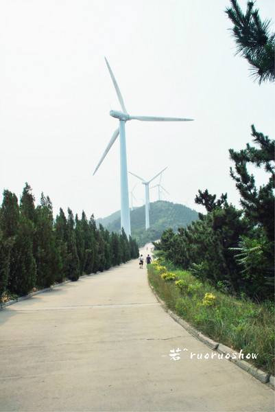 第三天的時(shí)光留給了“林海烽山”。烽山上到處都有長(zhǎng)島的標(biāo)志——風(fēng)車,前兩天只是遠(yuǎn)眺,今天,可以近距離的瞧瞧這些富有童趣的大風(fēng)車了。站在風(fēng)車底下,抬頭看著轉(zhuǎn)動(dòng)的葉片,忽明忽暗的影子不停地變幻,不同的是,吹風(fēng)車的已不再是我們……但是,長(zhǎng)島上的風(fēng)車卻有著實(shí)際的作用,就是發(fā)電,每轉(zhuǎn)動(dòng)一圈能產(chǎn)生一元錢的電,環(huán)保。爬到山頂,我們沿著369級(jí)的石階一級(jí)一級(jí)地下,便又來到了海邊,再次看到大海,突然有種回歸的感受,心曠神怡。牟大叔說“下了369級(jí)臺(tái)階,千萬別原路返回,沿著海邊走,走到另一頭,也有能上山的路,出口就能看到黃渤海交界處”,于是,我們便沿著海慢慢走,走著走著,發(fā)現(xiàn)整個(gè)海灘只剩下我們四個(gè)人,時(shí)間也好像靜止一般。上山的路有臺(tái)階也有坡路,一番辛苦,終于到達(dá)山頂,黃渤海的交界處可以直接看到,如果想看得更加清晰,也可以租個(gè)高倍望遠(yuǎn)鏡(費(fèi)用:3元)。