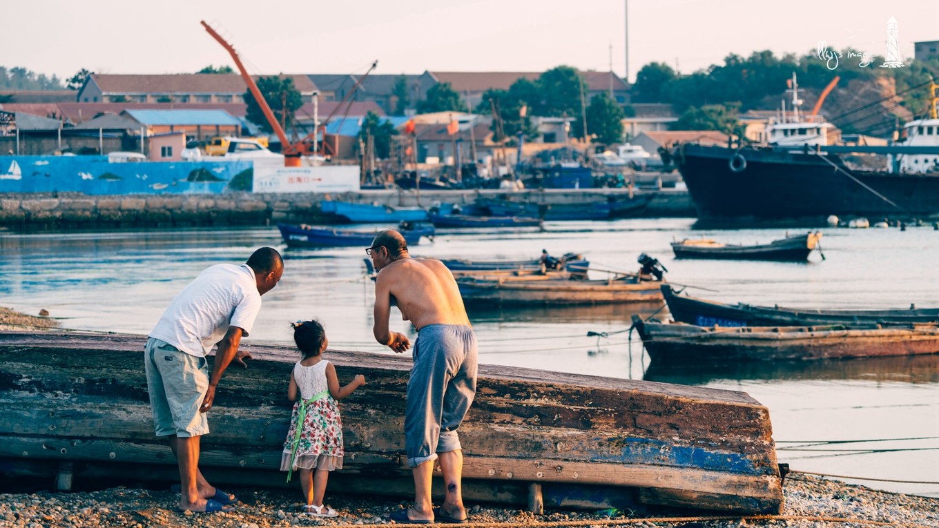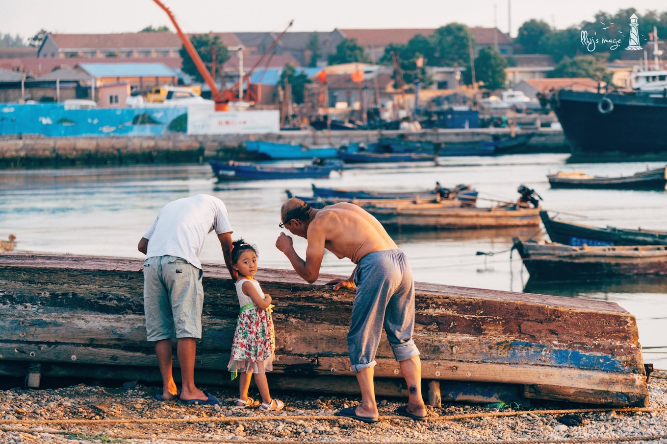 道路一側是成排的磚瓦房,另一側是停滿漁船的平靜海面。漁港基調是青黃色的,掉漆的漁船是青黃相間的,磚墻是黃色的,光著膀子的本地漢子蹬著銹跡斑斑的三輪車從堤壩上慢悠悠地駛過。整個畫面透出時光悠長的味道,仿佛一張沉睡相冊多年的老照片。