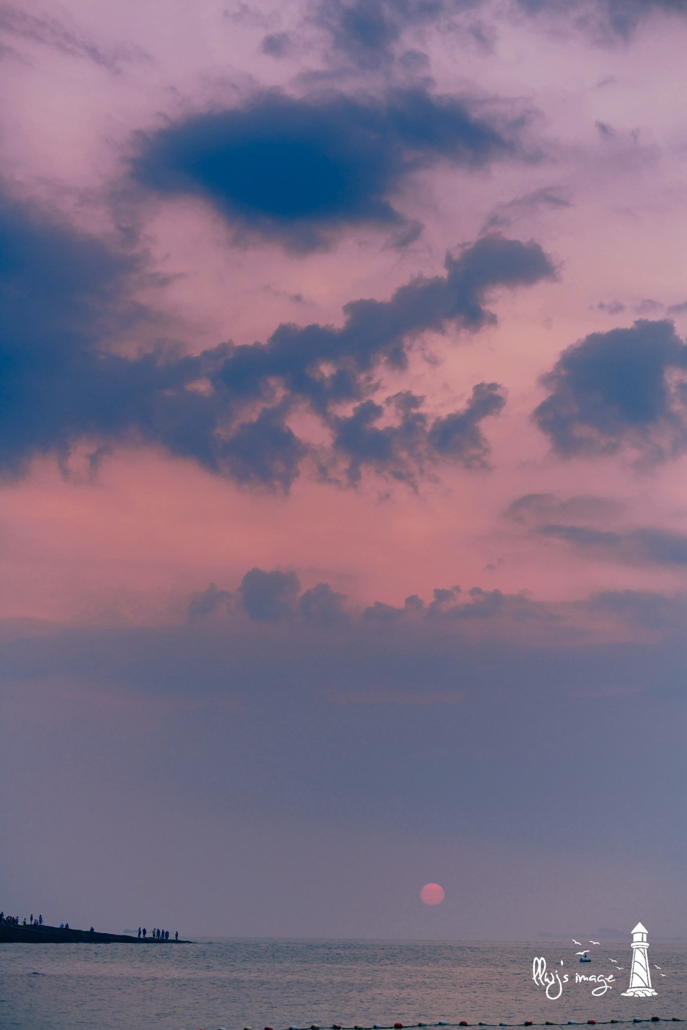 突然天空又變得通透,夕陽在海平面上慢慢浮現(xiàn),云彩被晚霞照亮,淡淡的如同暈染開的水墨。