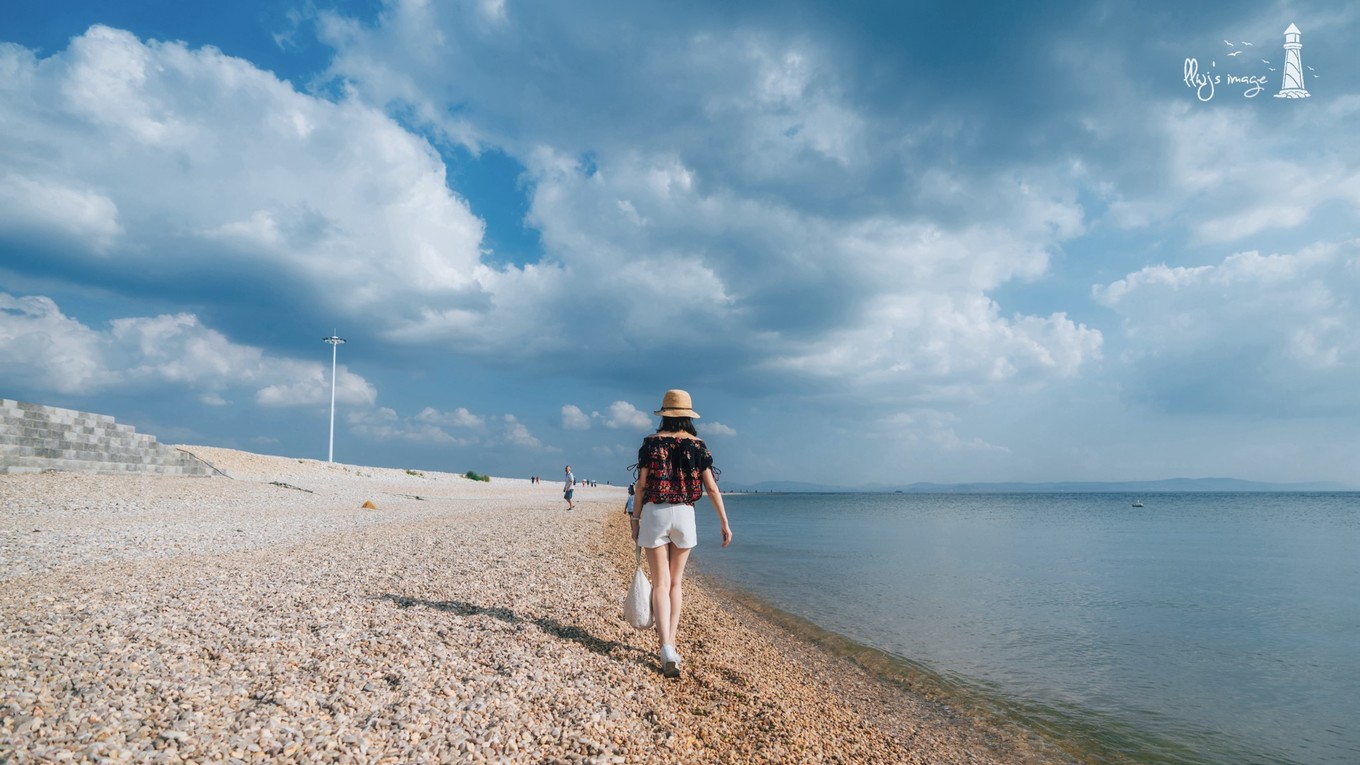 還是這條柏油路,跨過一個小坡,俯沖下去仿佛就能直接進到海里。海浪溫柔地沖刷著卵石灘,霎時就將我倆從暈船的胸悶眩暈中拉回浪漫的海邊。