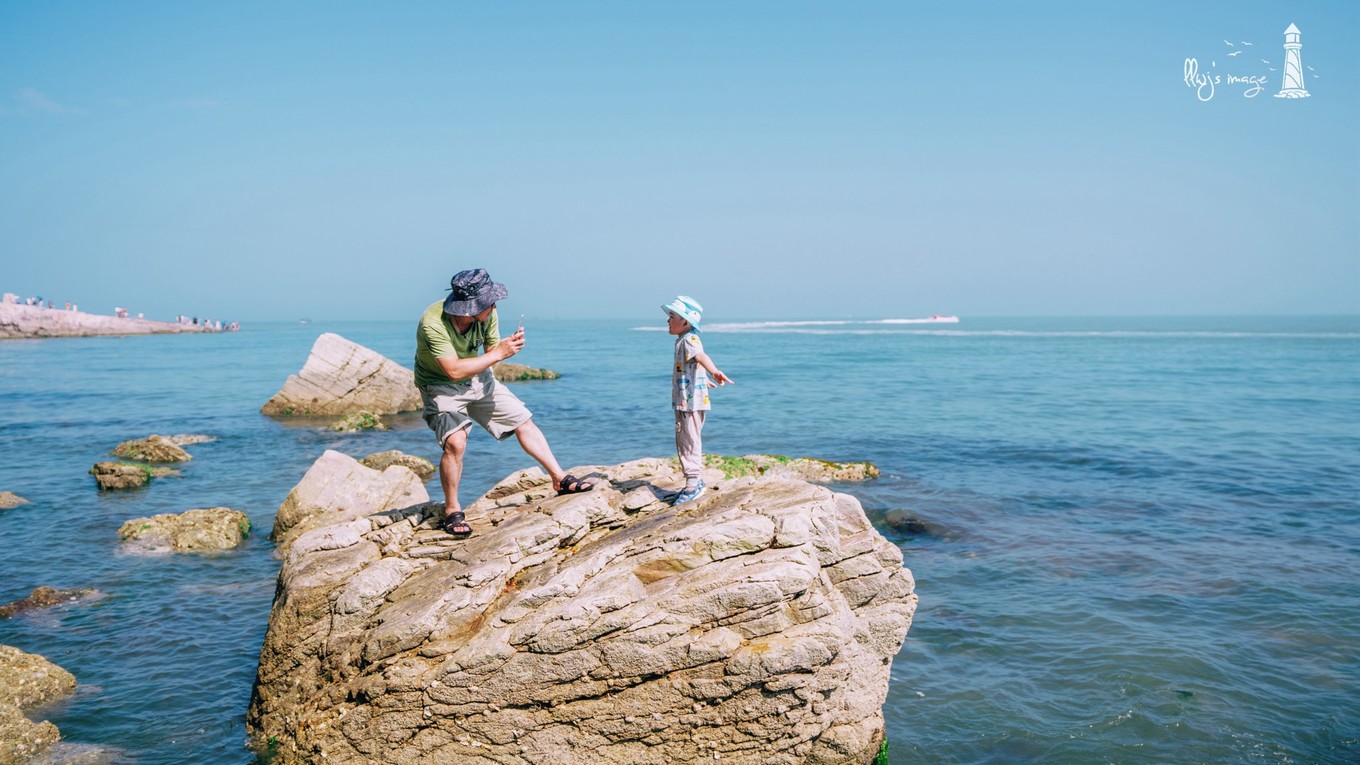 穿著牛仔褲的男生半跪在水里給女友拍照,一位父親將孩子抱上礁石,鼓勵著他勇敢張開雙臂。
