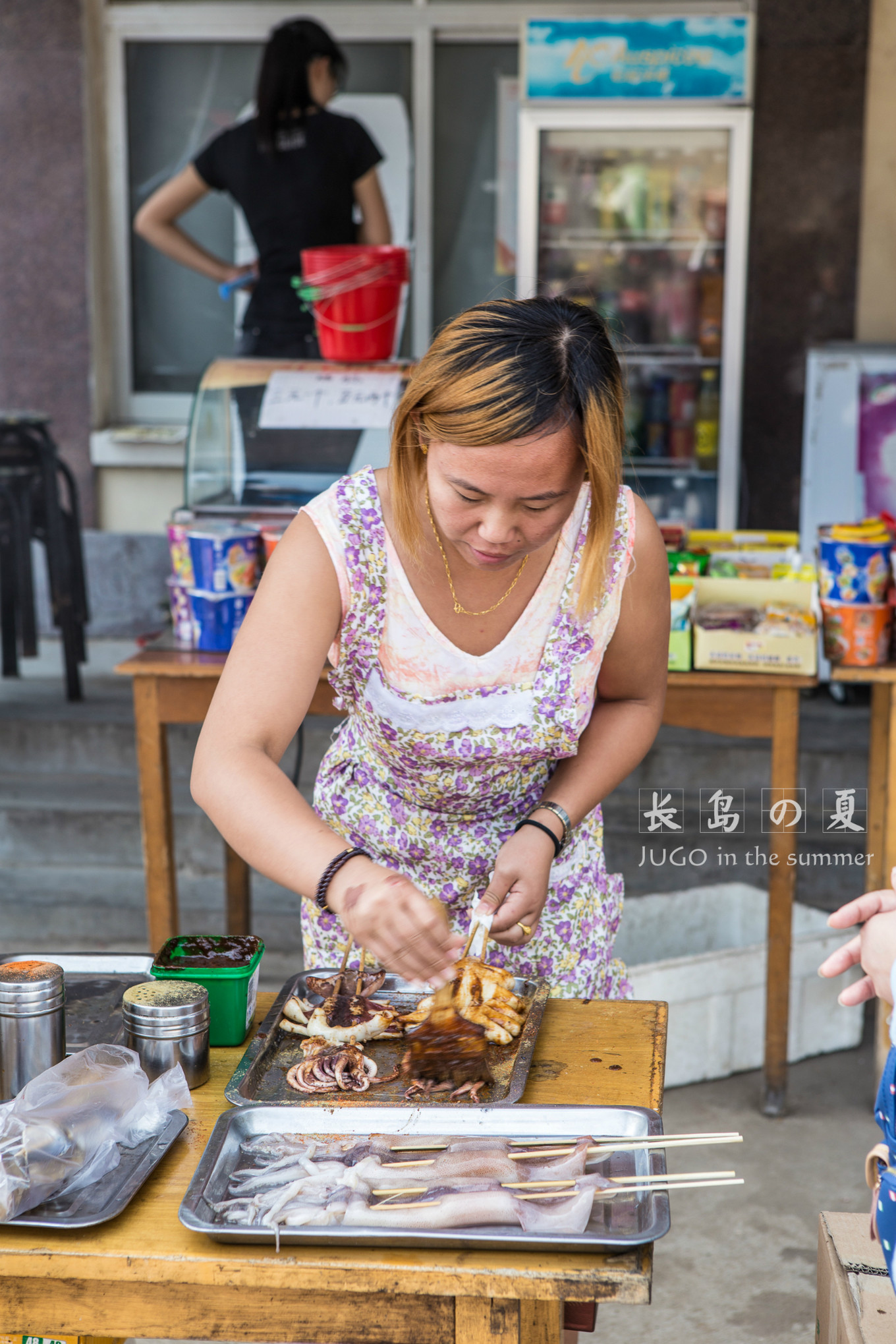 景區(qū)門外到處都是賣鐵板魷魚的攤販。