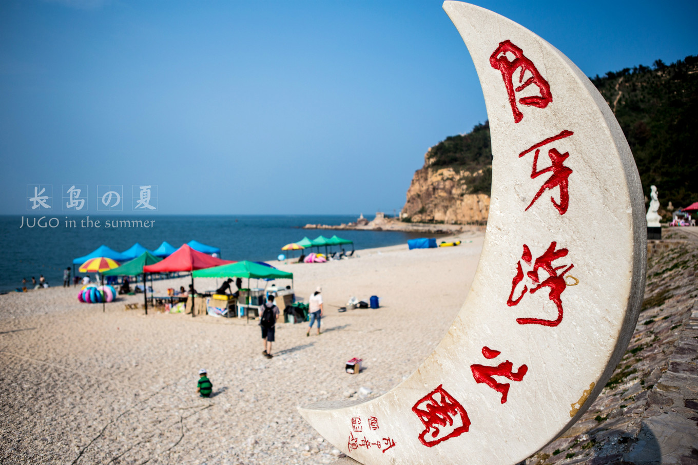 (1)月牙灣:位于北長(zhǎng)山島的北部,這里的石頭很特別,是圓滑的球石。這里是天然的浴場(chǎng),有很多人在沙灘邊玩耍和嬉戲。