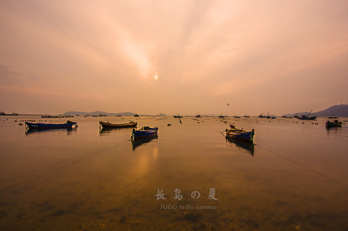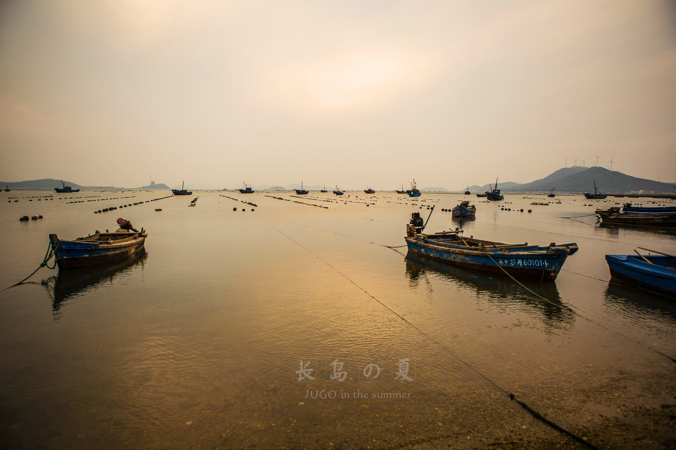 金色的夕陽(yáng)灑在平靜的海面上,漁船三三兩兩??恐?。