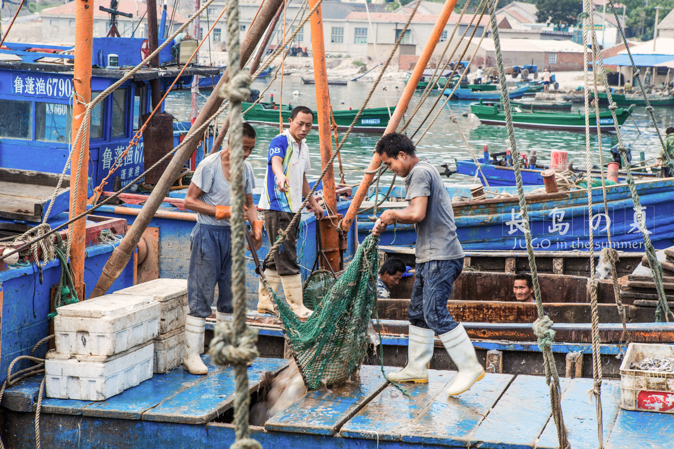 碼頭邊漁民們?cè)谑斋@。