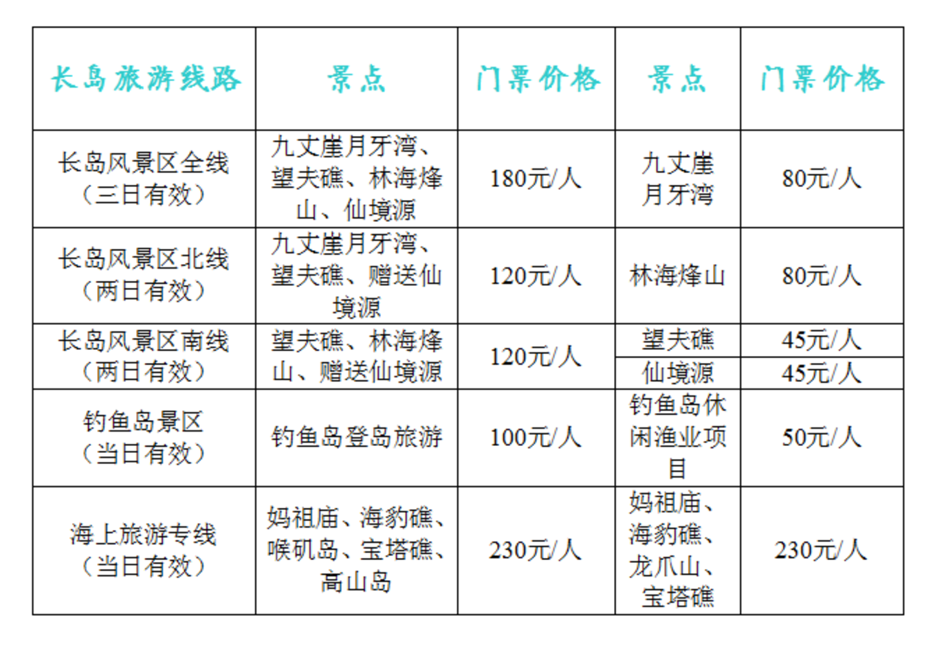 注:長(zhǎng)島交通全程包車,包車價(jià)格兩天250元。