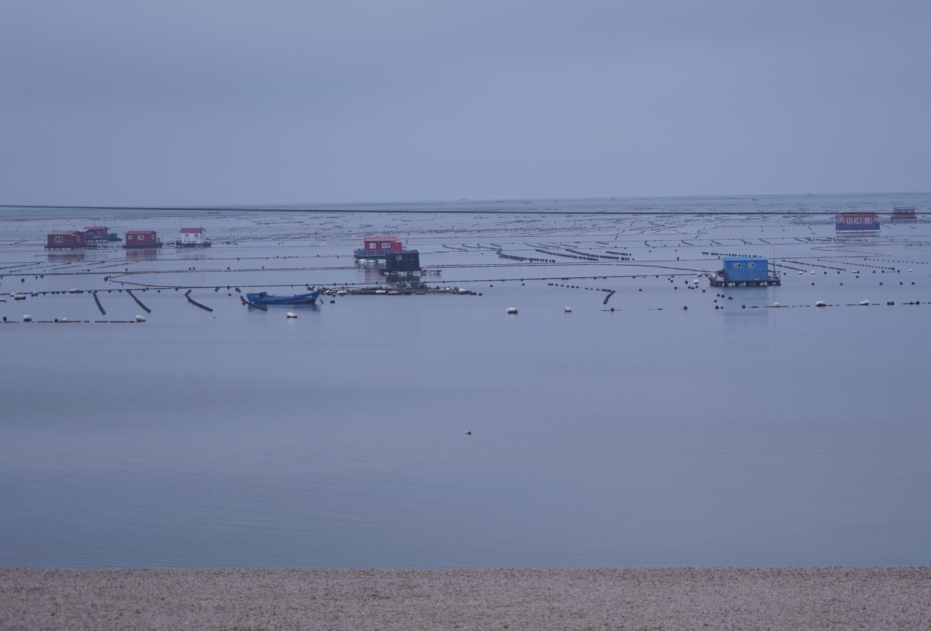 長山島把一波碧水分為兩個世界,島的外海面對黃海和渤海,汪洋浩淼,為天然捕撈漁場;島面對大陸的內(nèi)海卻風(fēng)平浪靜,為水產(chǎn)養(yǎng)殖的提供便利。圖為大片扇貝人工養(yǎng)殖場。