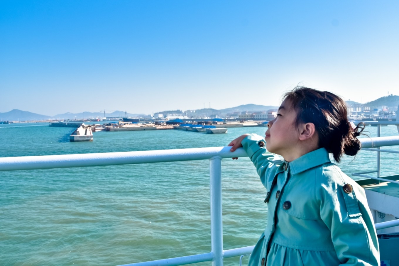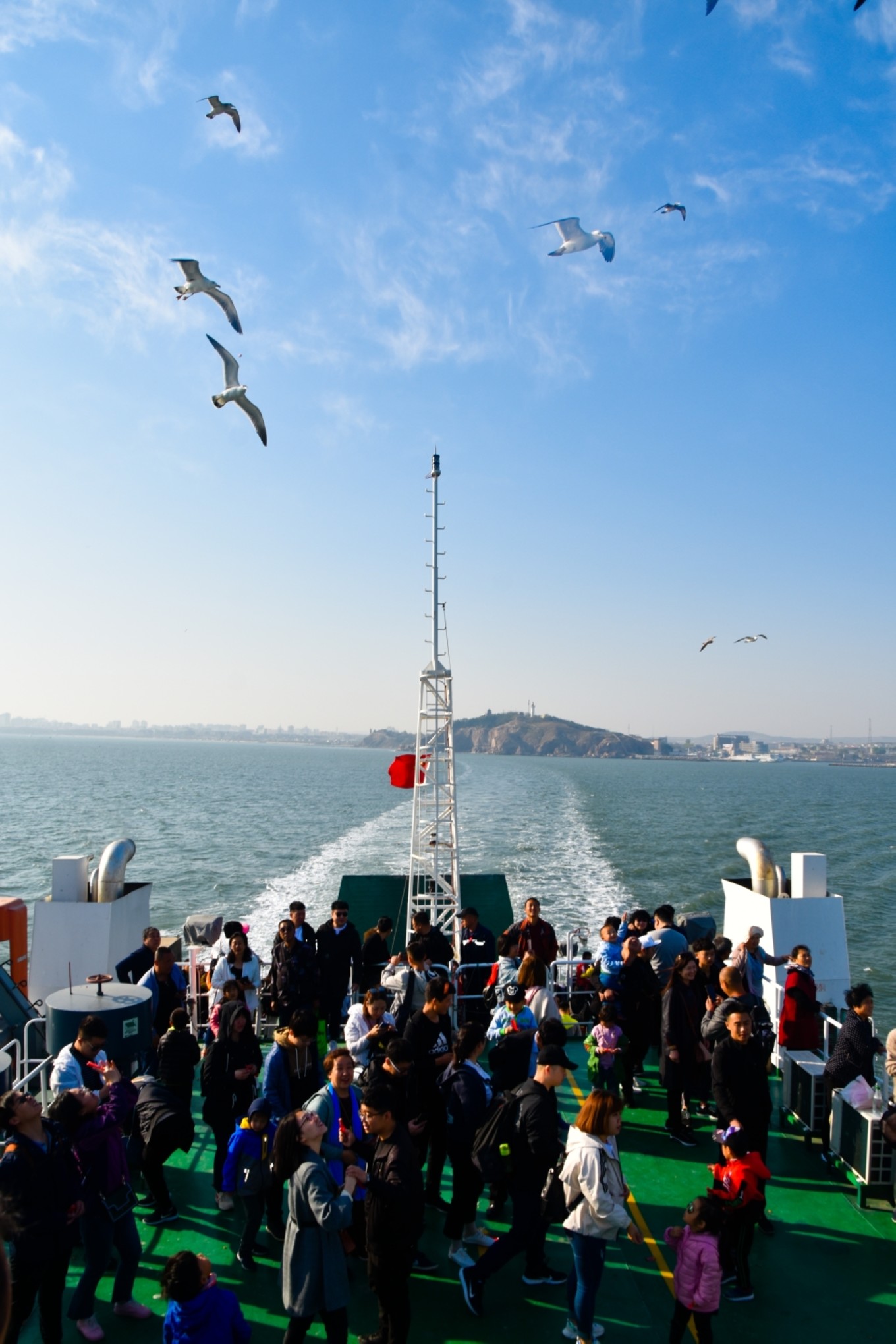 準(zhǔn)備登船,船分三層,最下面一層用來擺渡貨車和私家轎車,第二層用來擺渡旅客,第三層可以每人加十元錢近距離喂食海鷗。而我們此行目的就是為了讓考拉體驗(yàn)親近海鷗每人加了十元錢上到了三層甲板。這錢花的值?。「咛幍娘L(fēng)景就是好!