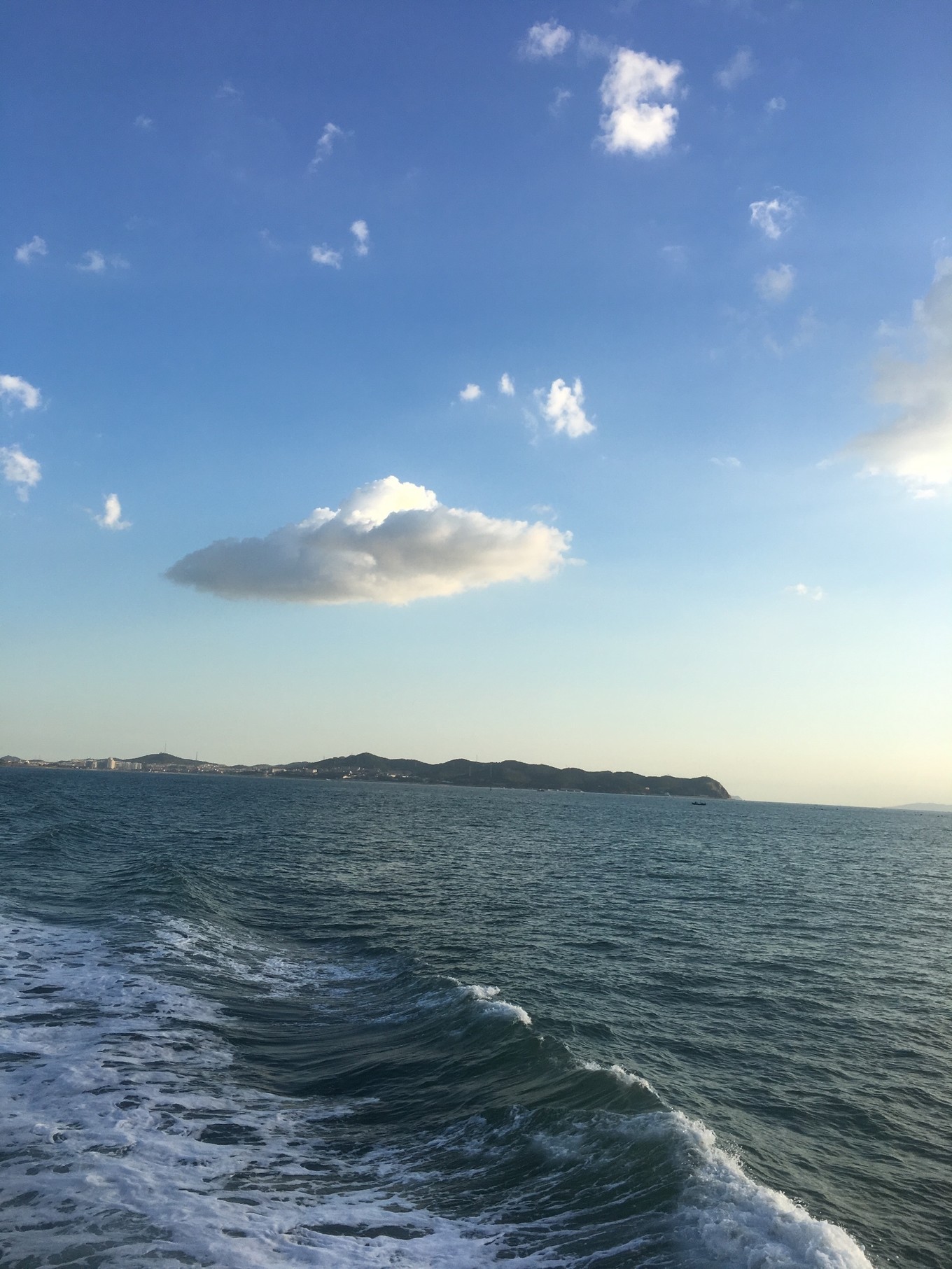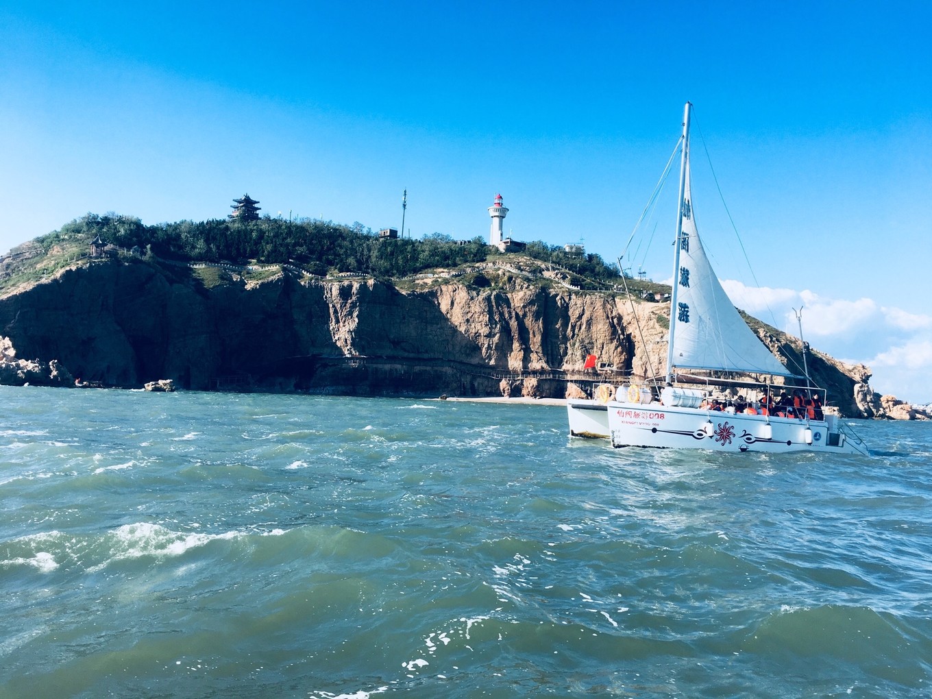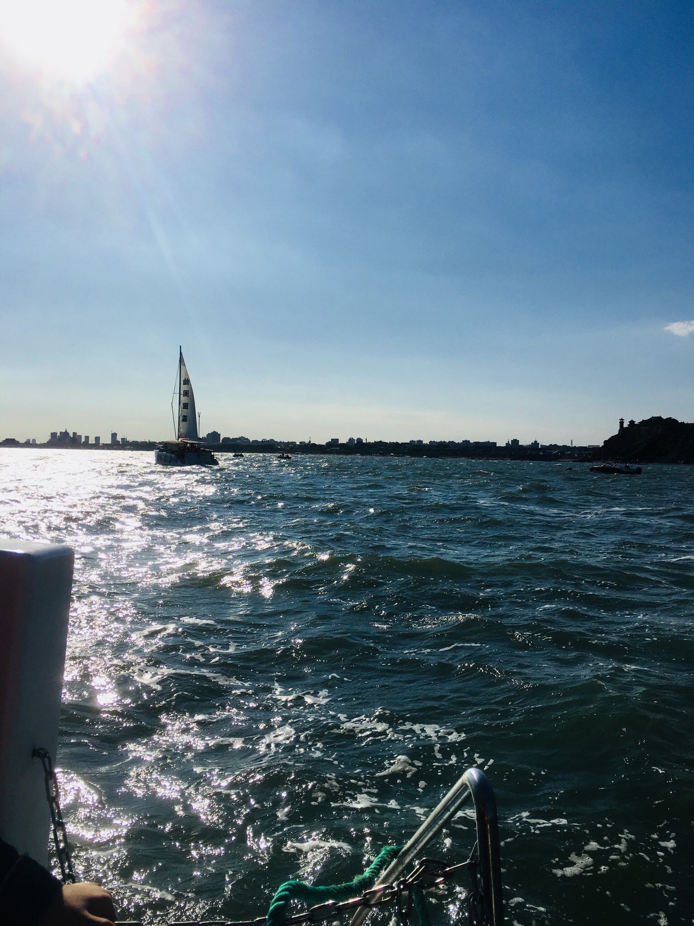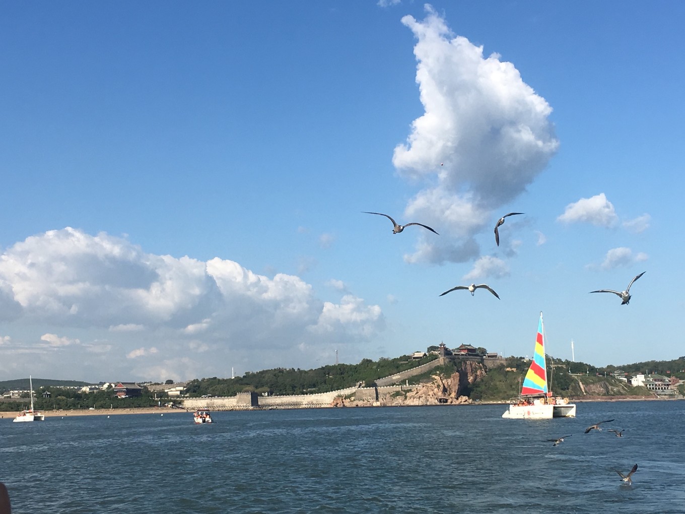 第三天-帆船??早上趕上了早一班的帆船,海鷗圍繞著帆,海風(fēng)拍打著浪,波光粼粼的海面,陽光照的讓人覺得很舒服,兩岸是蓬萊閣和八仙洞,聽說了很多神話故事。船開到海中心,黃渤海的交界處,黃色和藍色的海水銜接著,這可能就是“一腳踏兩海,兩耳聽雙濤”的即視感吧。