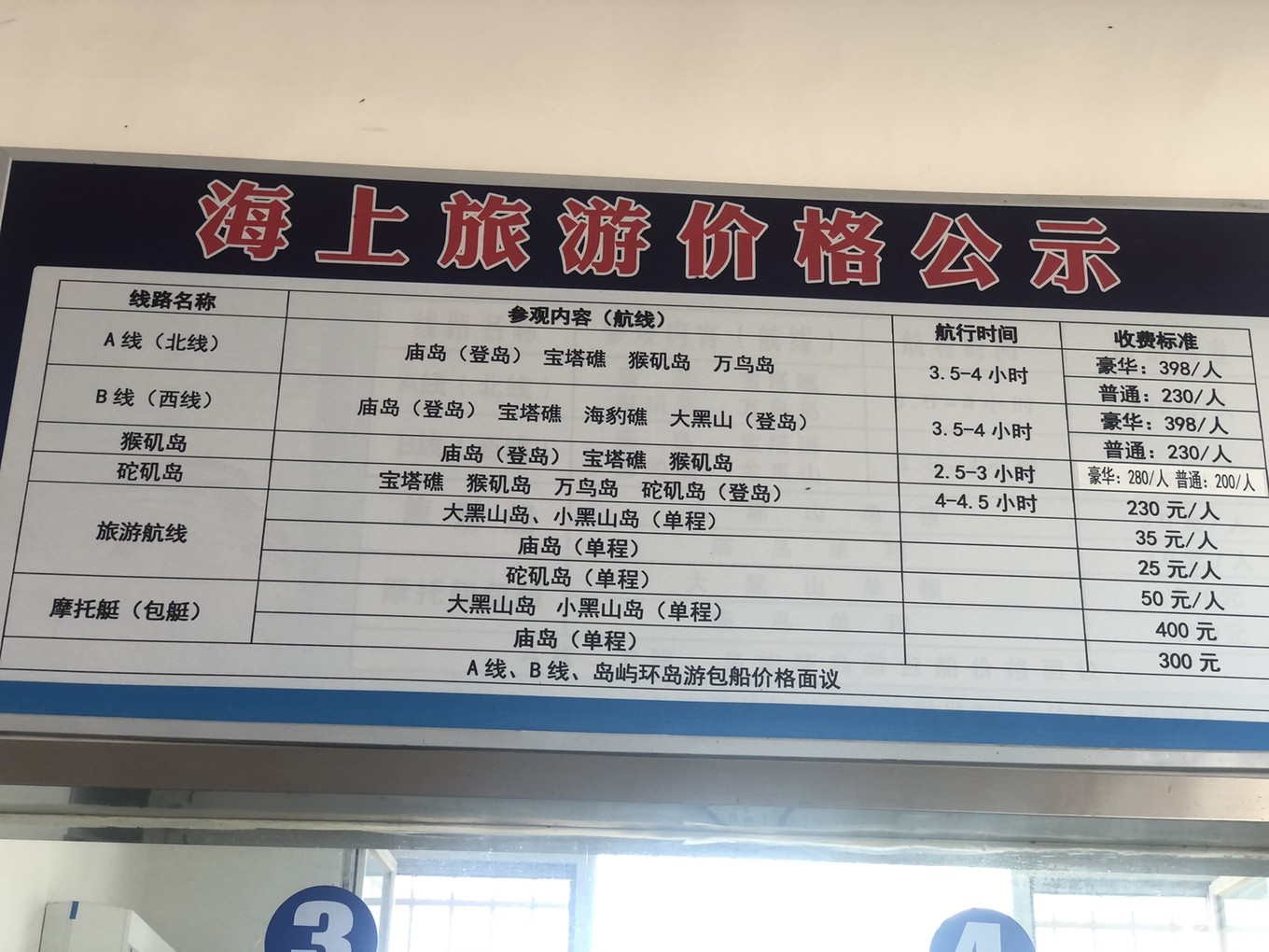 去大黑山的游客比較少所以船的班次比較少,在海上游碼頭買(mǎi)的早上八點(diǎn)海馬5號(hào)船票。海馬5號(hào)出航時(shí)間是長(zhǎng)島-大黑山 8:0014:00 大黑山-長(zhǎng)島11:00 16:00 航程40分鐘。下船后有電瓶車(chē)到景區(qū),門(mén)票50元。景區(qū)不大但是風(fēng)景超贊,大黑山離城市比較遠(yuǎn),沒(méi)有污染水非常清澈,是本次旅行最美的景點(diǎn)。玩完正好趕上11:00回長(zhǎng)島的船。
