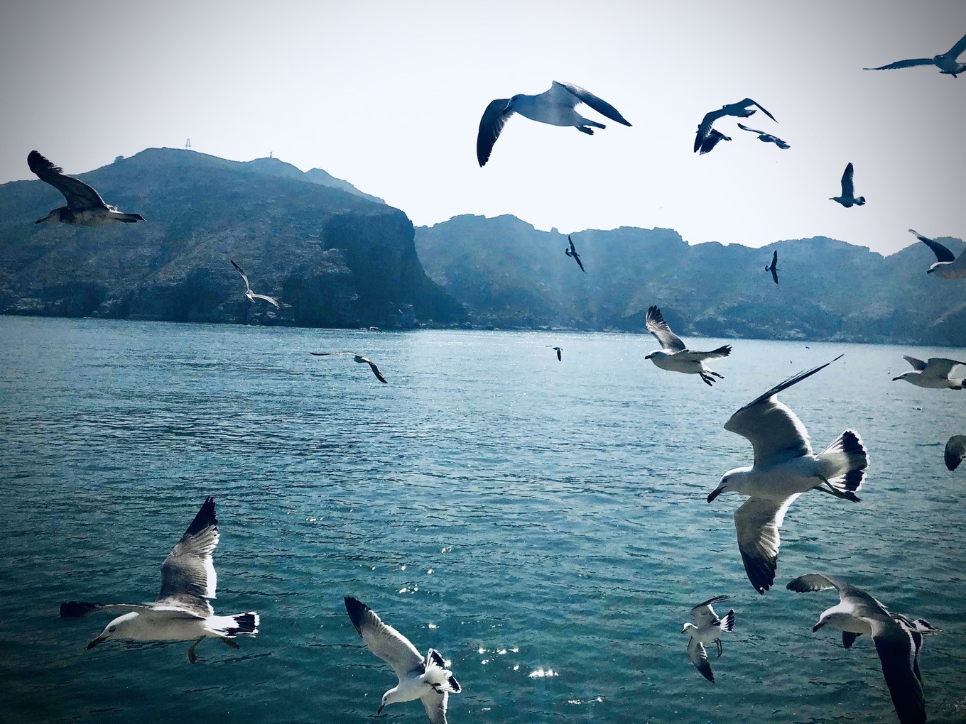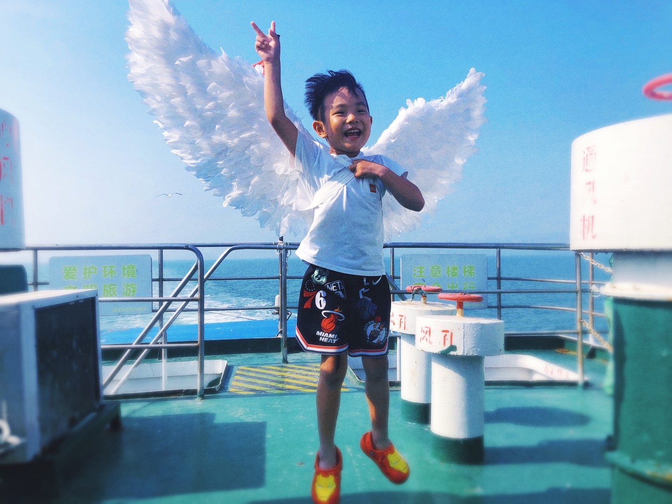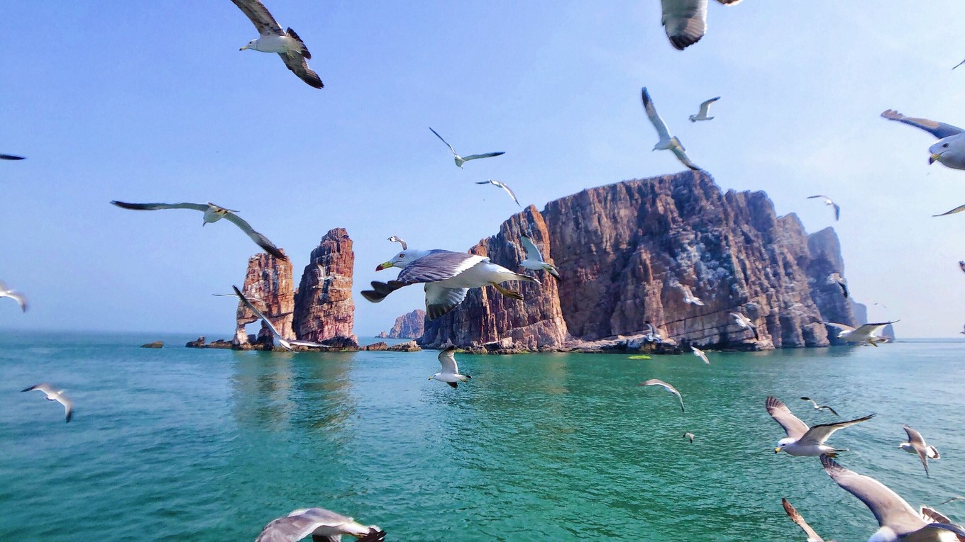 下午:去蓬萊最具代表的萬(wàn)鳥(niǎo)島。酒店幫忙訂的票價(jià)格150元,13:15到海上游碼頭換票,13:30開(kāi)航全程大約3個(gè)半小時(shí),上船后需要每人增加58元升艙,升艙非常有必要,因?yàn)榭梢詿o(wú)遮擋的近距離接觸喂食海鷗。如果帶小孩上船前一定要多買(mǎi)些火腿腸,升艙會(huì)贈(zèng)送一些魚(yú)蝦腸,有小孩的話不夠用。