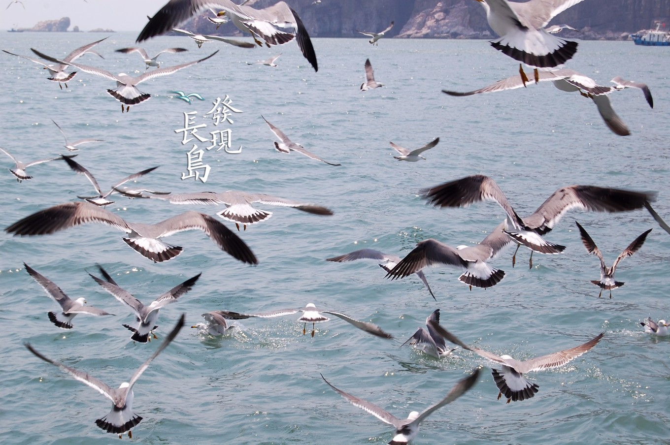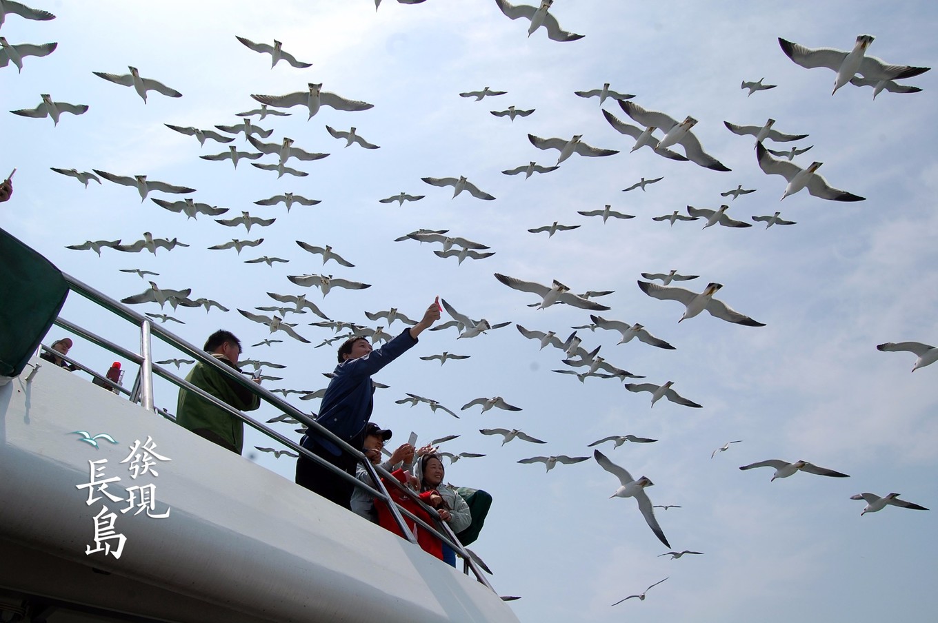 萬鳥島到了,成千上萬只海鷗圍繞著游船飛舞,有種遮天蔽日的感覺。整條船被海鷗包圍著,左右兩邊和船頂?shù)钠脚_(tái)上方都是密密麻麻的海鷗,不知道是人來看鳥,還是鳥在看人。旁邊的小女孩激動(dòng)的不知道該說些什么,一直在喊“好美呀~好美呀”。第一次看見如此壯觀的景象,也是第一次與海上的精靈們?nèi)绱私嚯x接觸,觸手可及,這種場面頗為震撼。