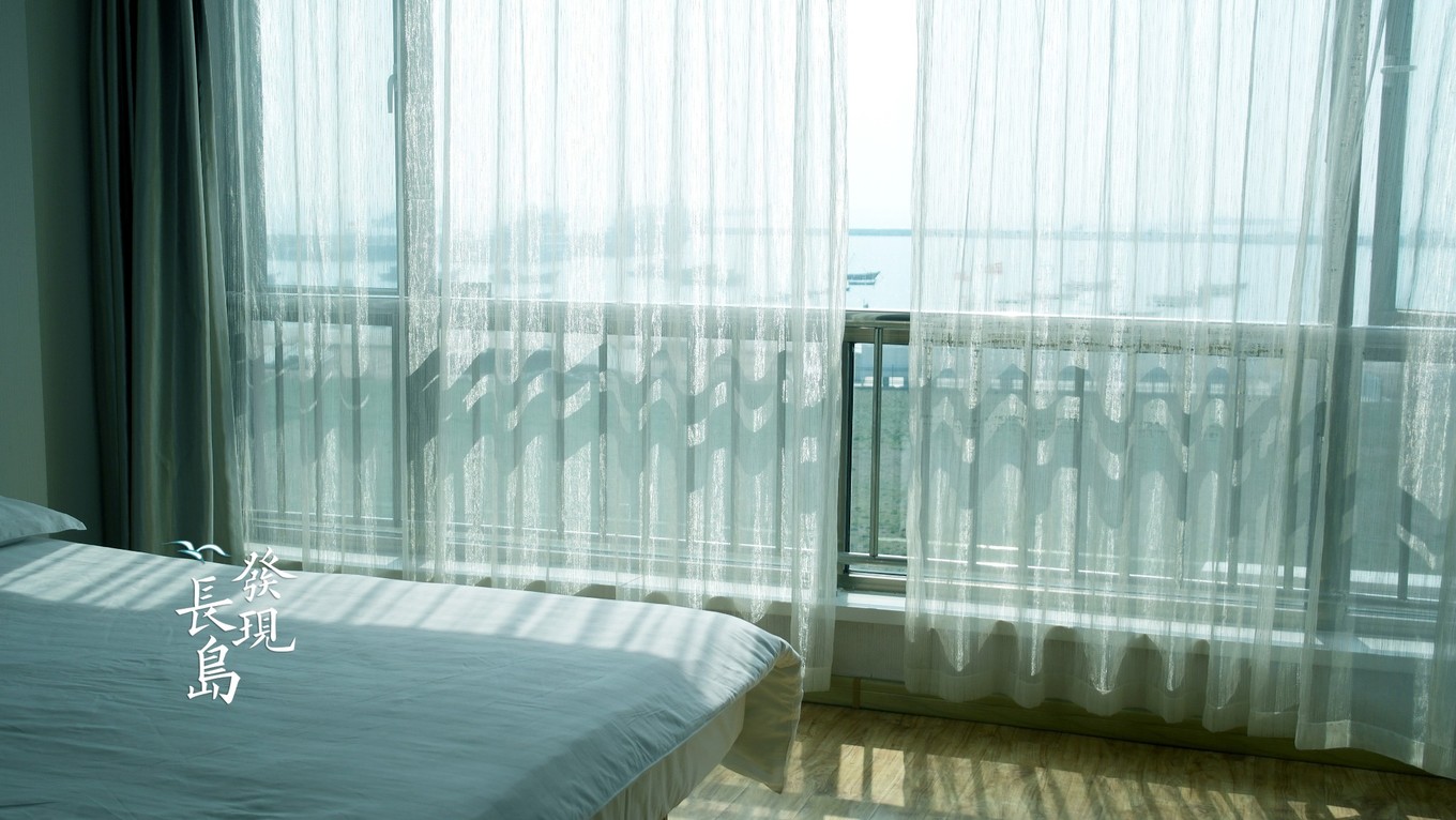 廟島之游結(jié)束后,繼續(xù)乘船返回長島?;氐骄频晔窍挛鐑牲c(diǎn)多,打開房門的時(shí)候,被眼前的景色吸引了,窗外是湛藍(lán)的大海,陽光暖暖的透過窗簾灑進(jìn)房間。這個(gè)時(shí)候愜意的睡個(gè)午覺正好。
