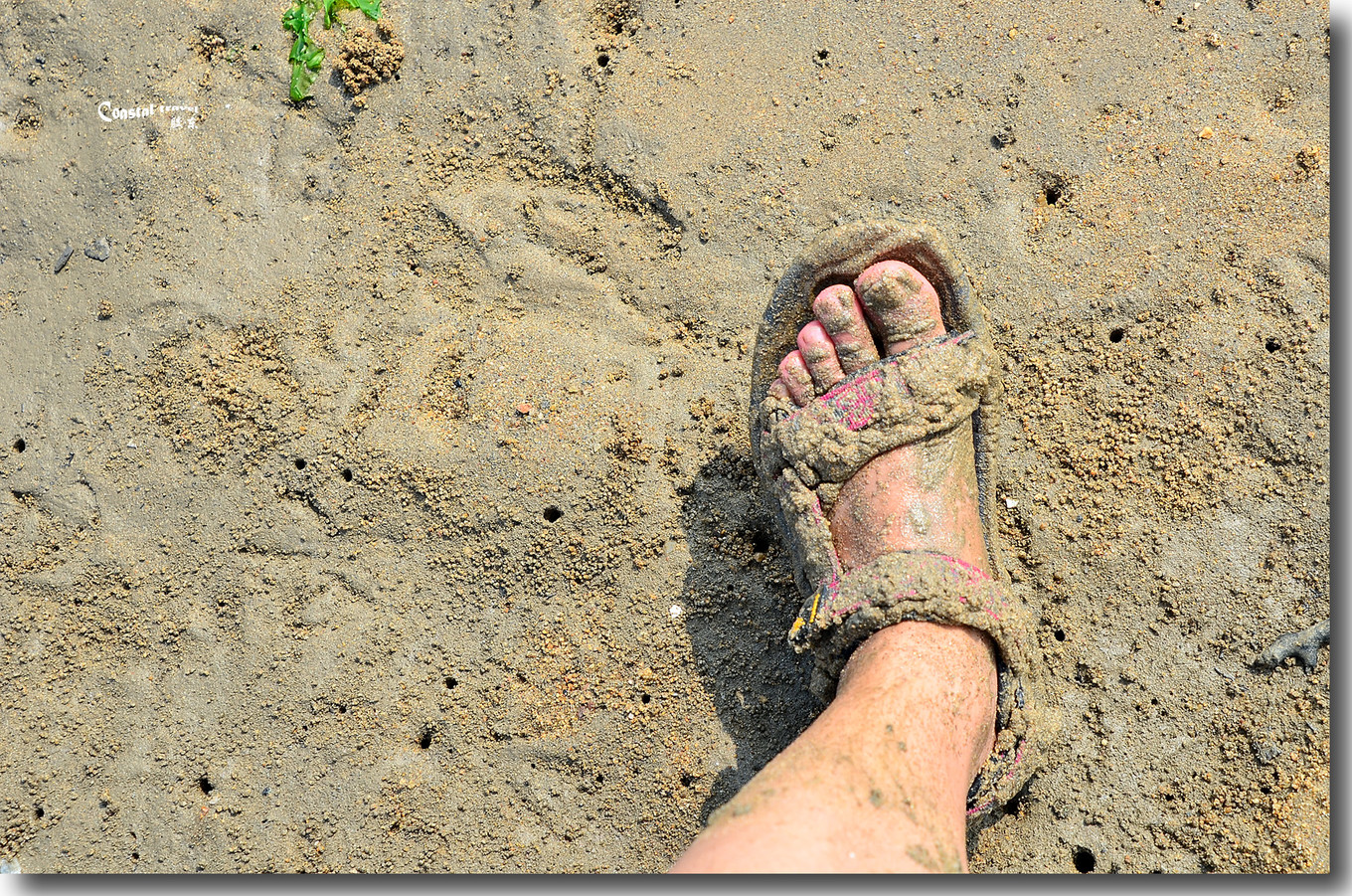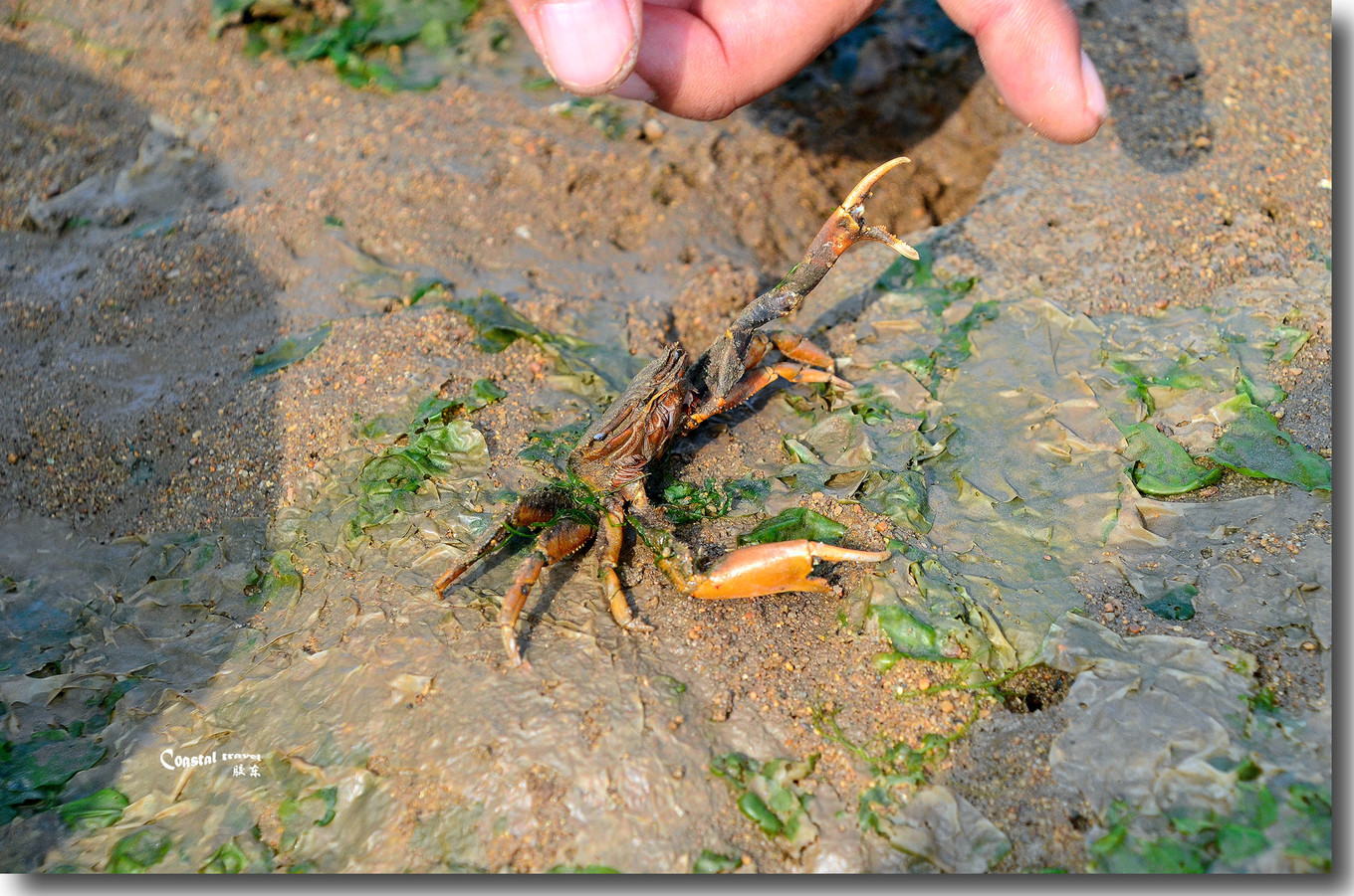 淺灘上密密麻麻的螃蟹洞,找大的一鏟子挖下去就能看到螃蟹,看這只還舉手示威呢