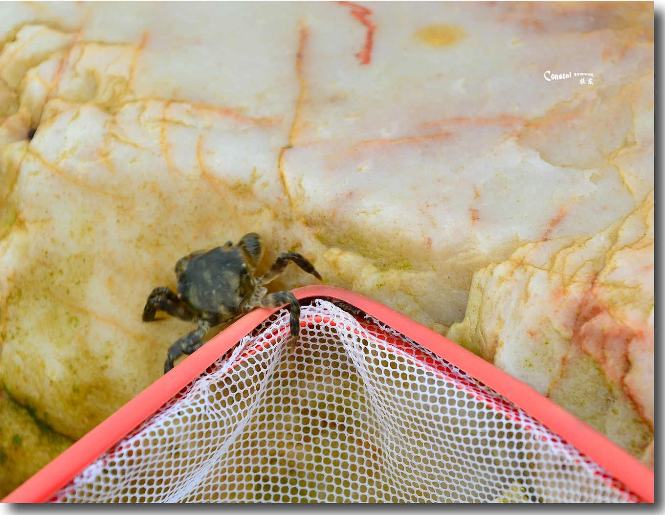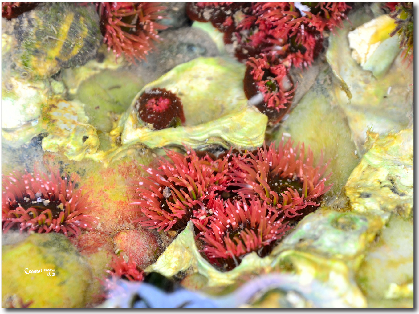 岸邊礁石上的小水洼里長著很多小???,用手指碰到它的時(shí)候就會收縮,很有趣!