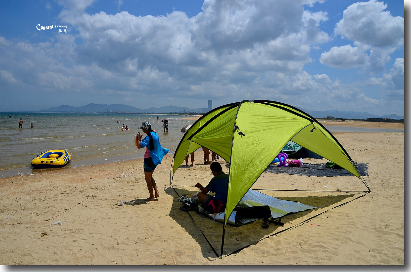 繞島一圈后決定去浴場玩耍,終于有一個(gè)可以隨意搭帳篷的海灘了。海邊風(fēng)有點(diǎn)大,費(fèi)了九牛二虎之力才把天幕搭起來,下次就有經(jīng)驗(yàn)了,風(fēng)大還是帳篷吧
