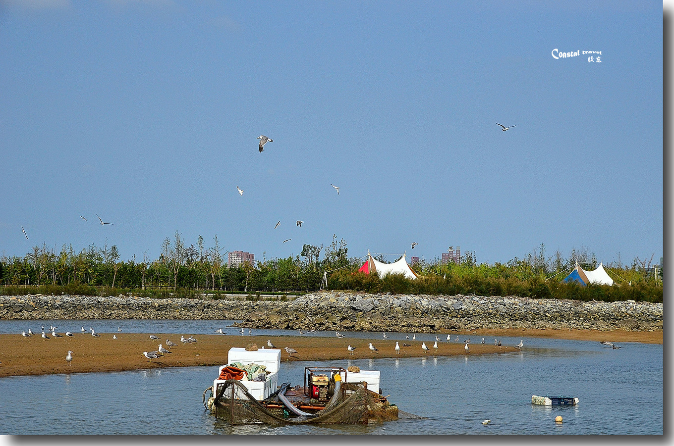 轉(zhuǎn)了一大圈回去把兩個(gè)懶蟲叫起來出發(fā),今天的目的地是養(yǎng)馬島,距煙臺市里也就20多KM。一路沿著海邊的公路行駛,路邊忽見一大片淺灘,看有人在趕海,拿著鏟子和桶也去湊湊熱鬧。估計(jì)有不少的小魚小蝦,有許多海鷗在覓食。