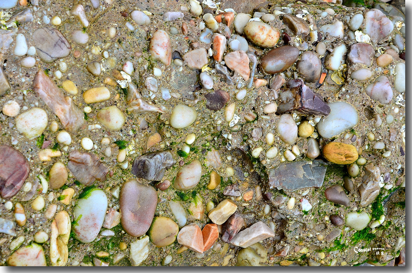 海邊一塊建筑遺留的水泥塊上,各種各樣的石頭很漂亮