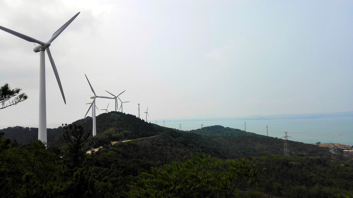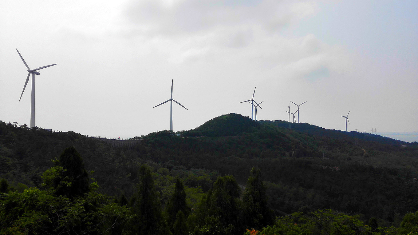 風(fēng)車發(fā)電。峰山公園里空氣好,爬山過程中爽朗的洗洗肺。