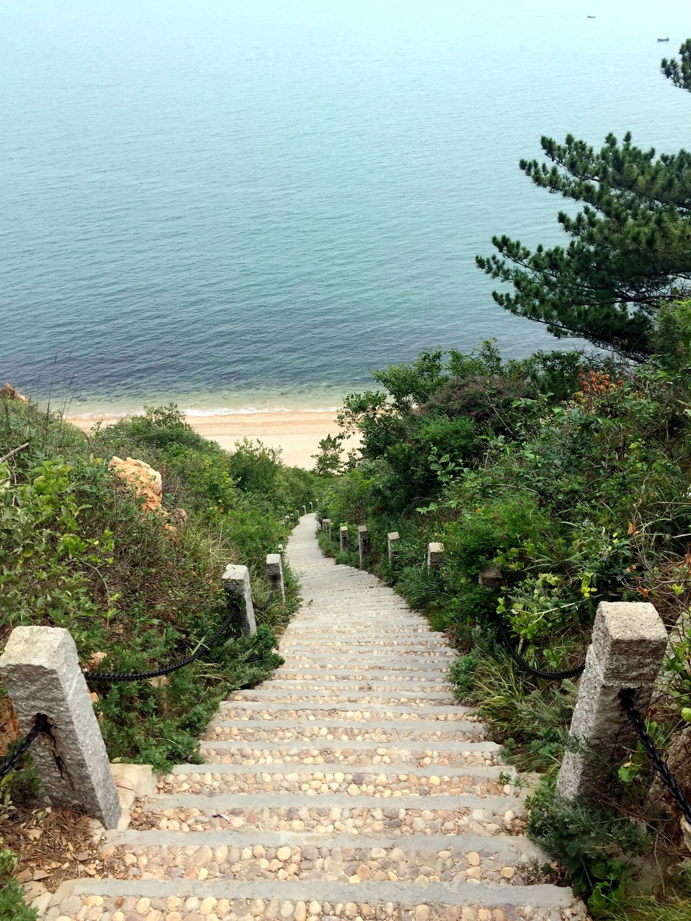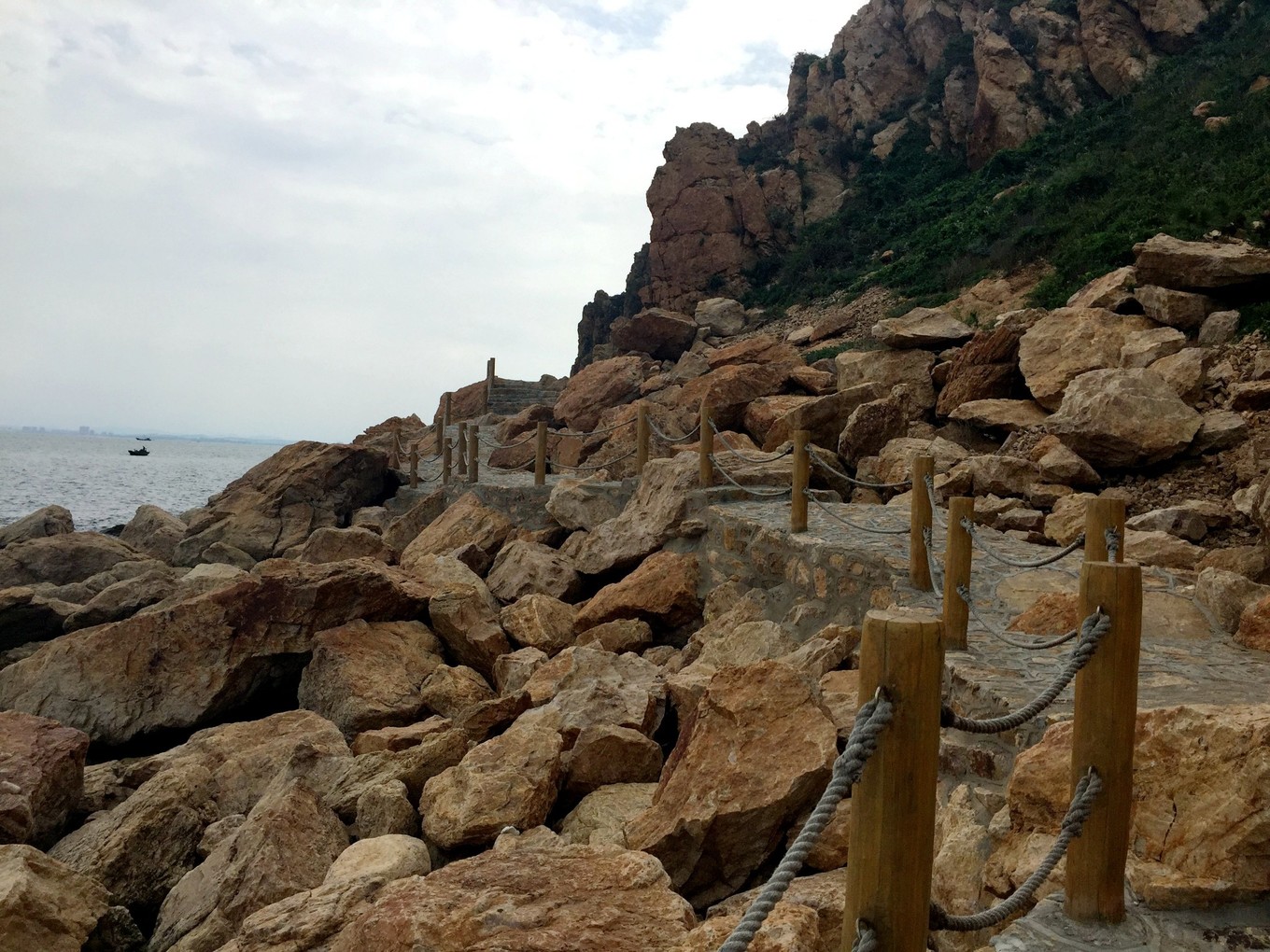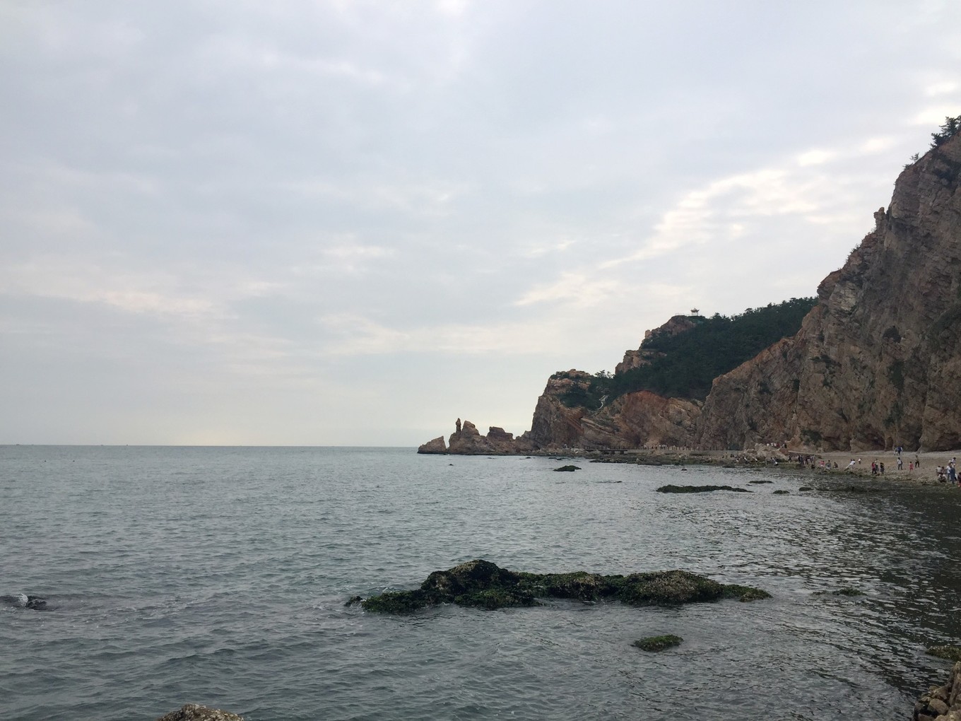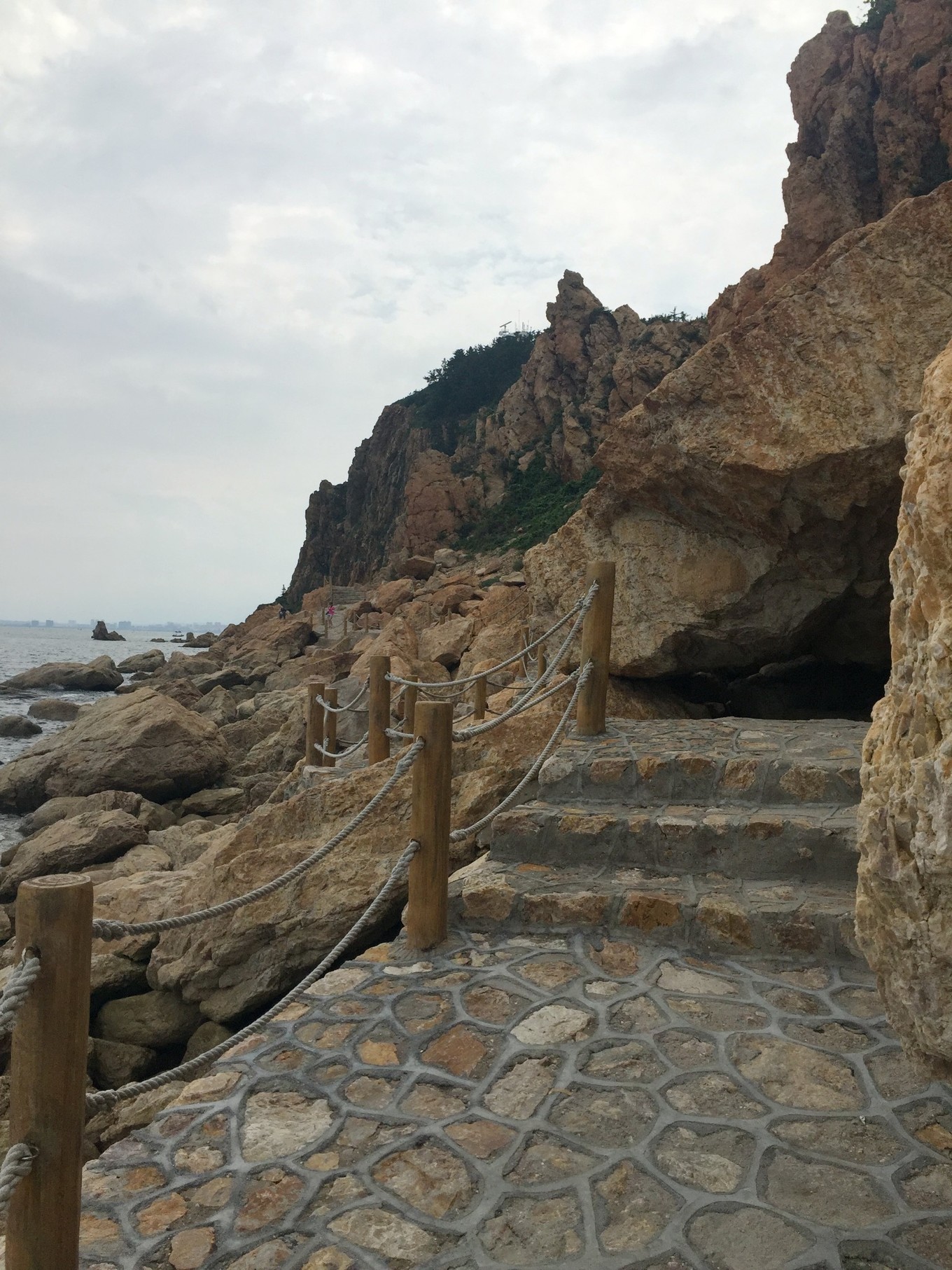臨海最有名的便是369臺(tái)階,師傅問我想爬上還是走下,果斷選擇下。。于是車停到369階上面,下去沿著海眼線就能走到黃渤海交匯的紀(jì)念碑,在順著漫道就可以走到黃渤海的交匯海灘上。但我覺得369階附近的景色真的美絕了~~~交界處顯然遜色了很多