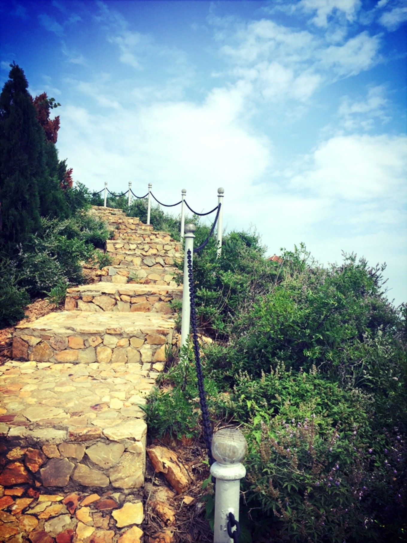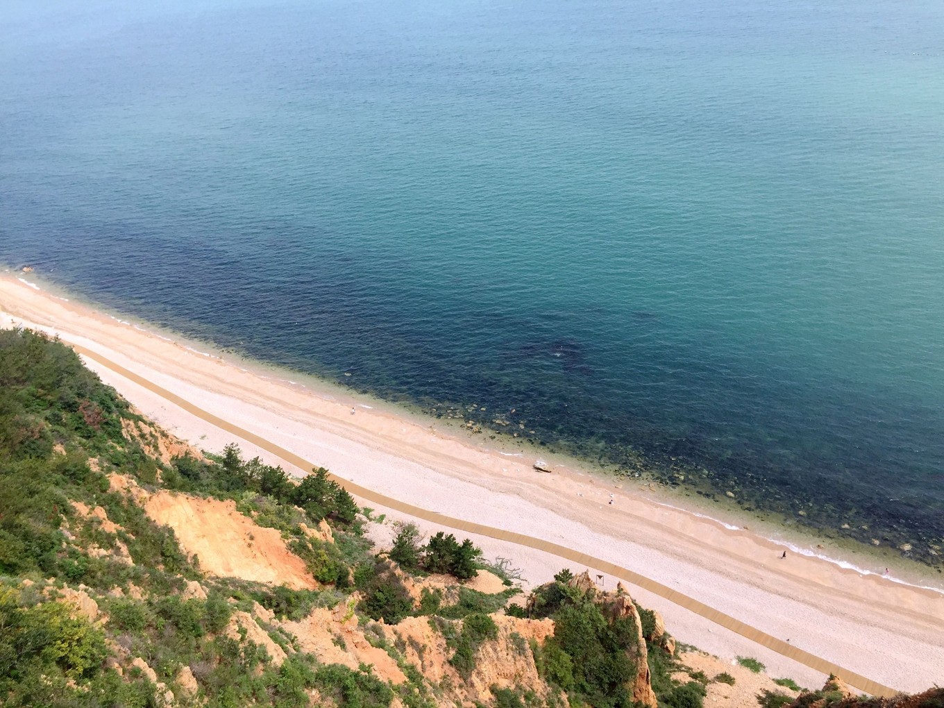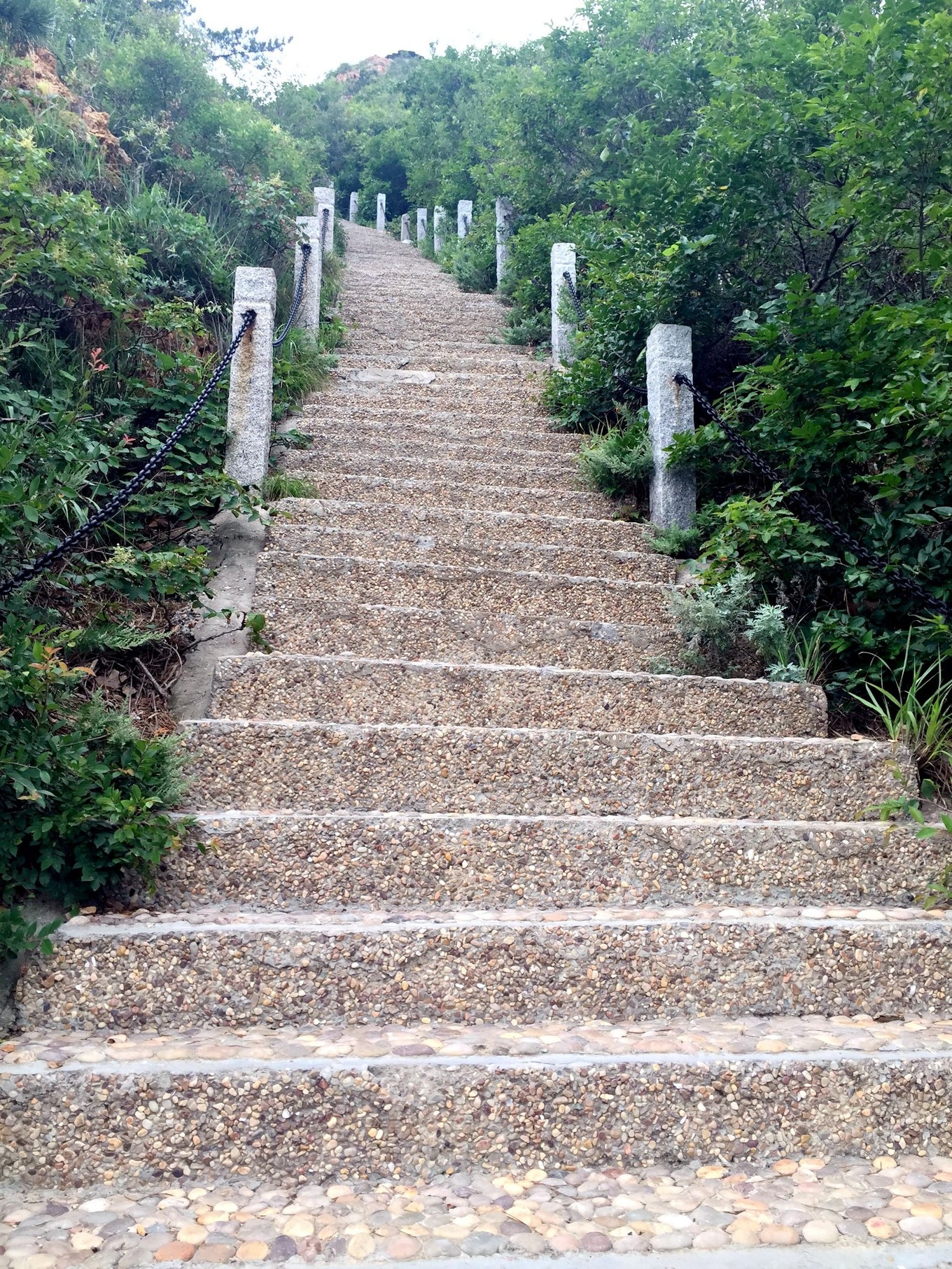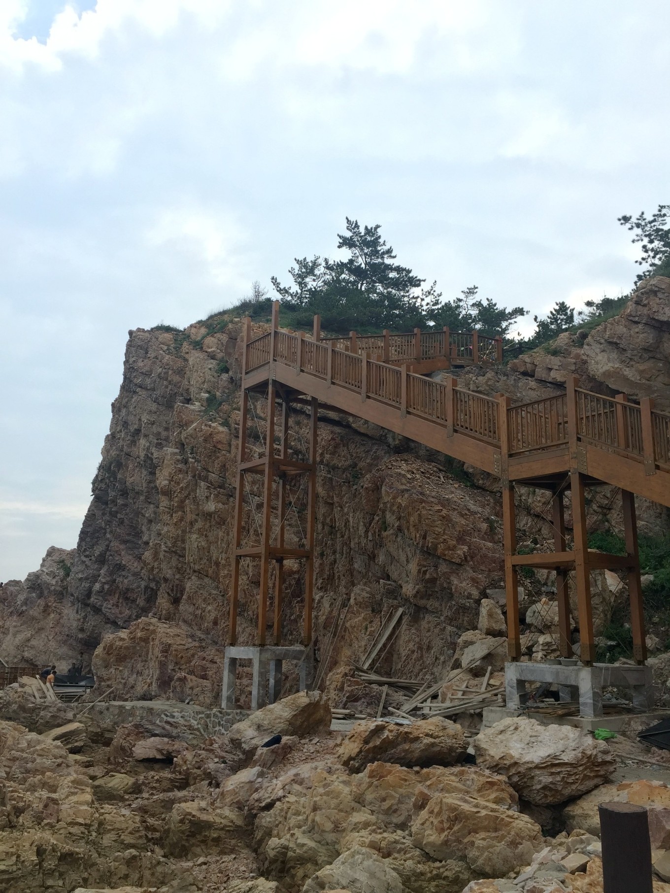 臨海最有名的便是369臺(tái)階,師傅問我想爬上還是走下,果斷選擇下。。于是車停到369階上面,下去沿著海眼線就能走到黃渤海交匯的紀(jì)念碑,在順著漫道就可以走到黃渤海的交匯海灘上。但我覺得369階附近的景色真的美絕了~~~交界處顯然遜色了很多